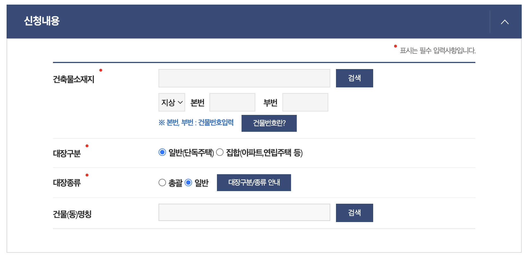 대장구분을 일반(단독주택) / 집합(아파트,연립주택 등) 선택에 따라 대장종류도 다르게 나타납니다.