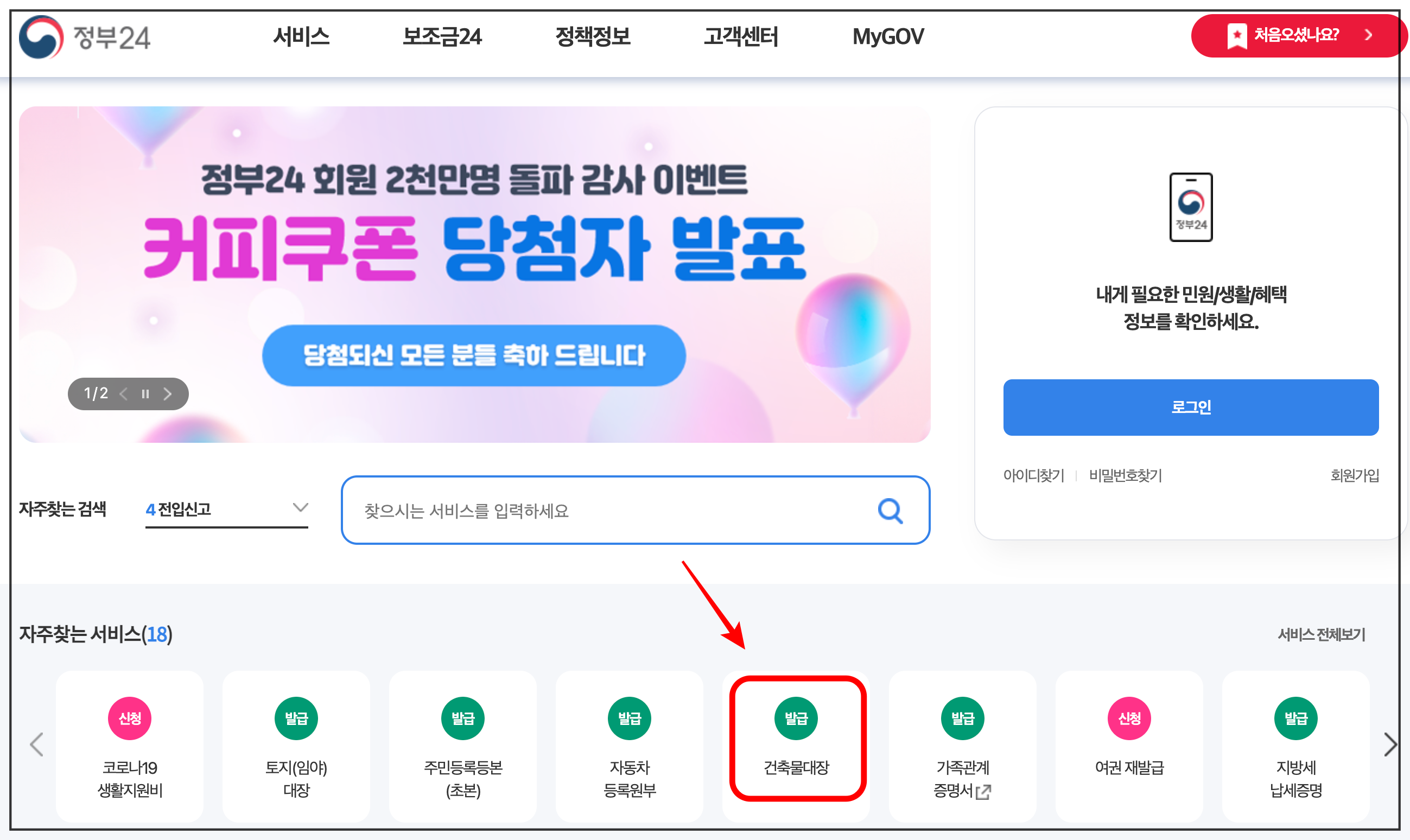 정부24 홈페이지에 접속하셨다면 화면 중앙 [ 자주찾는 서비스 ]가 보이실 겁니다. 이 메뉴 중 [ 건축물대장 ] 을 선택해 주세요.