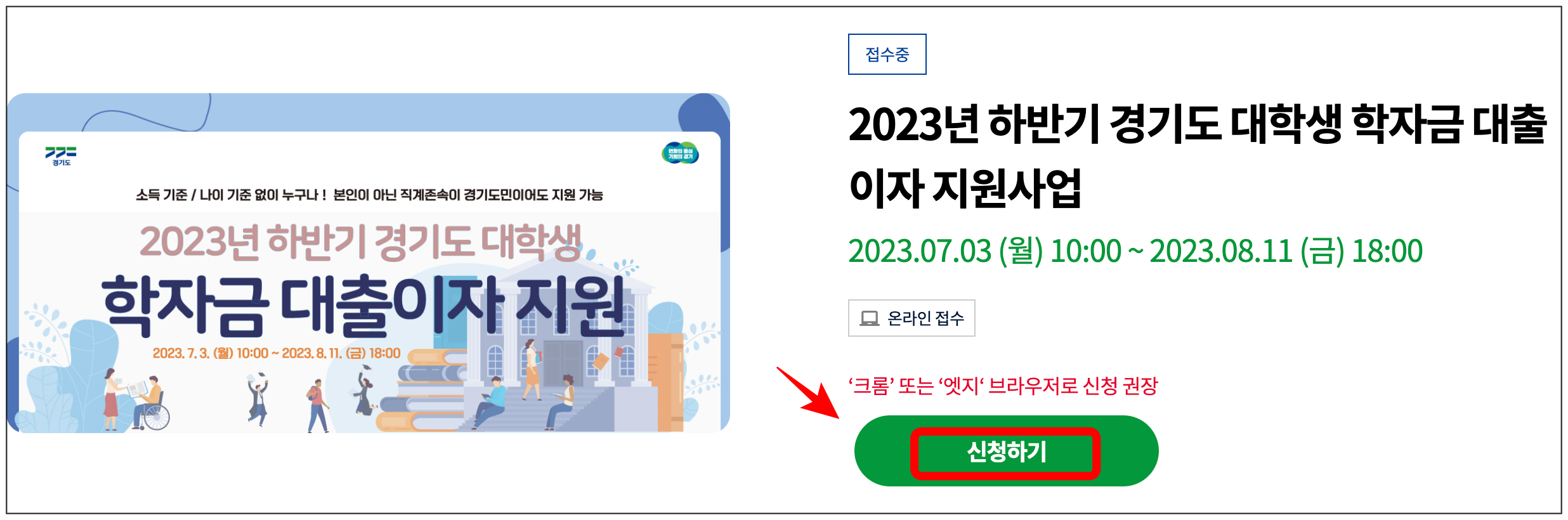 경기도에서는 도내 청년들의 경제적 부담을 덜고, 학업과 취업활동에 전념할 수 있도록 학자금 대출이자를 지원하고 있습니다.