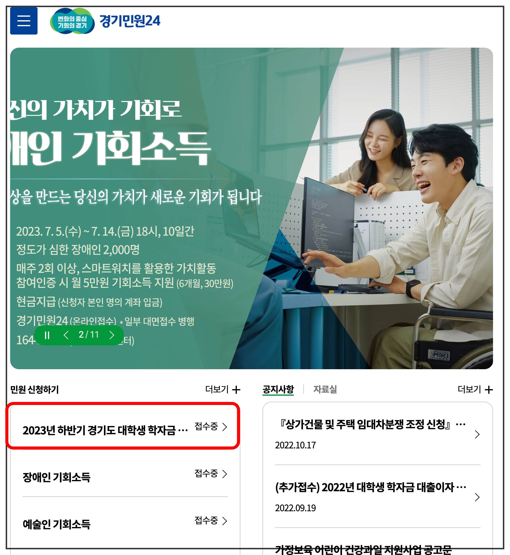 [민원 신청하기] > [2023년 하반기 경기도 대학생 학자대출이자 지원사업] 접수중 을 선택하시면 됩니다.