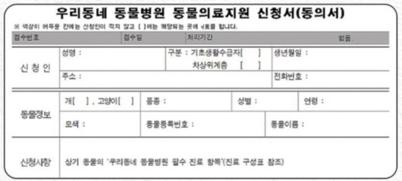 반려동물 의료비 지원제도는 반려동물의 병원비 부담을 덜고, 동물복지를 위하여 지자체에서 의료비를 제원하는 제도입니다. 중위소득 기준에 해당된다면 반료동물의 의료비를 지원받을 수 있습니다. (1인가구 기준 1,944,812원)