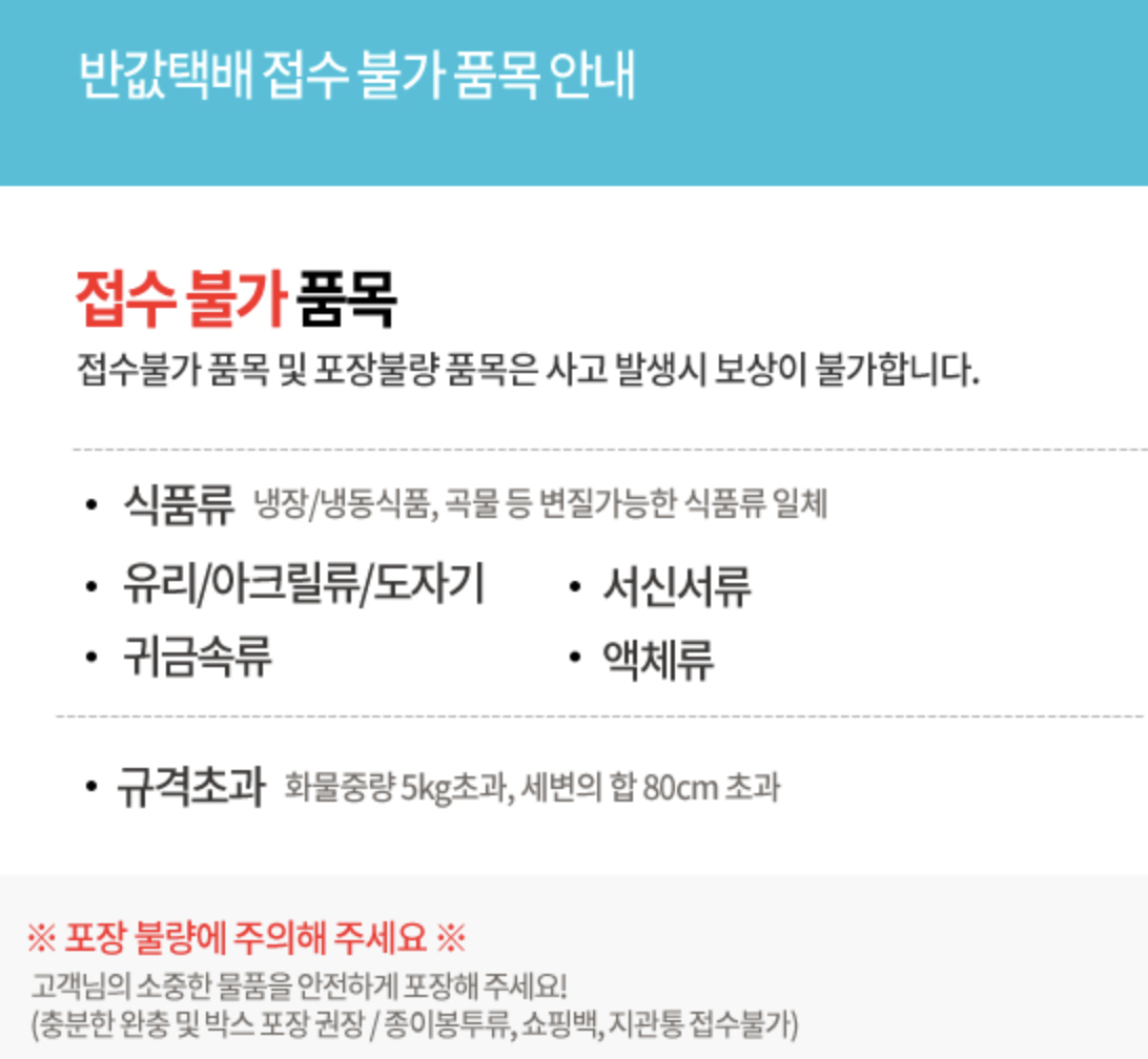 접수 불가 품목은 반값택배를 접수하러 가기 전 꼭 확인하시기 바랍니다. 식품류, 유리/도자기/아크릴류, 서신서류, 귀금속류, 액체류는 접수가 불가능합니다. 또한 화물중량 5kg을 초과하거나 세변의 합이 80cm를 초과한 규격 또한 접수가 불가합니다.