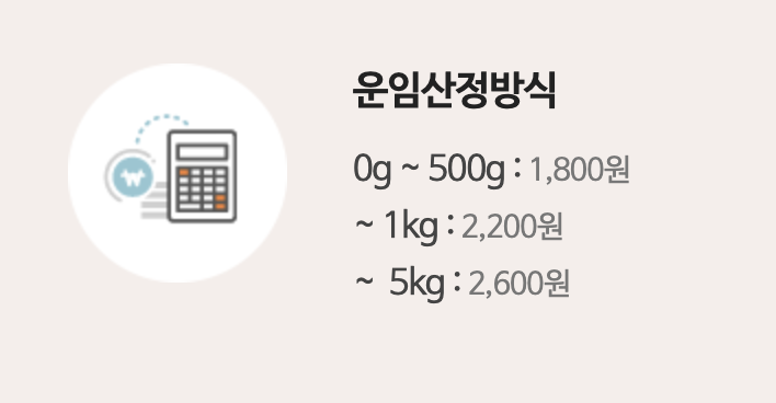 0g ~ 500g 까지는 1,800원 ~ 1kg 까지는 2,200원 ~5kg 까지는 2,600원입니다. 또한 거리에 따른 추가 운임은 없습니다.