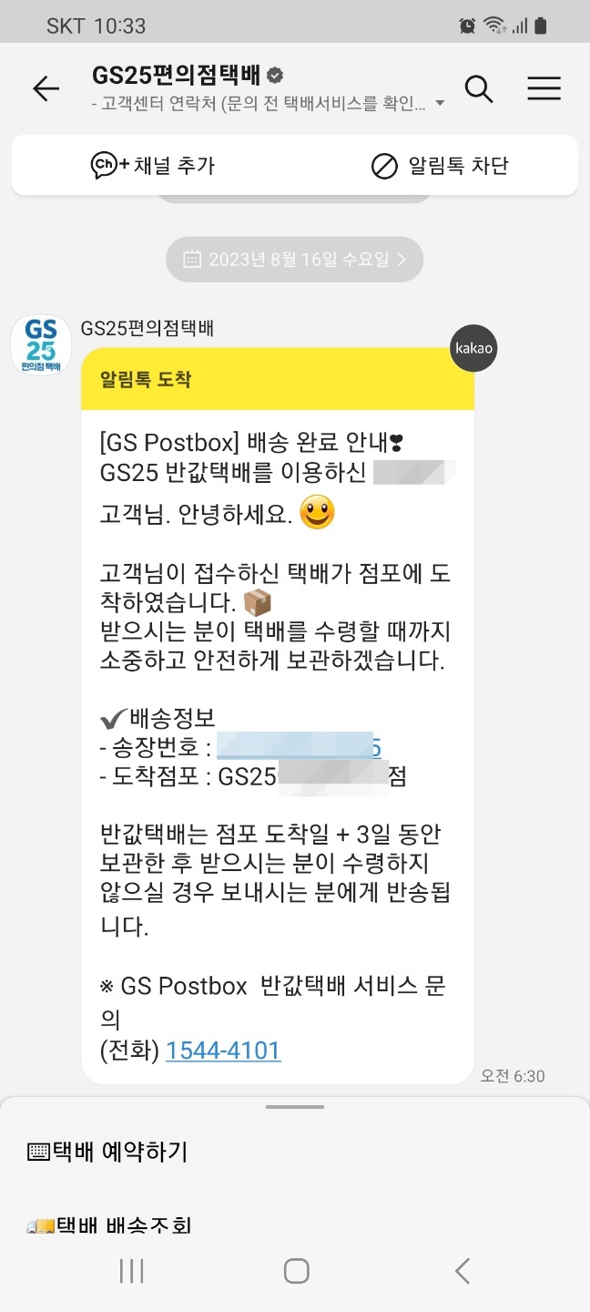 보낸 물건이 도착 편의점에 도착하면 카톡으로 메세지가 옵니다. 받는 분에게도 카톡이 전달되며, 도착점포에 방문하여 고객 확인용 QR코드를 보여주면 택배를 수령할 수 있습니다.