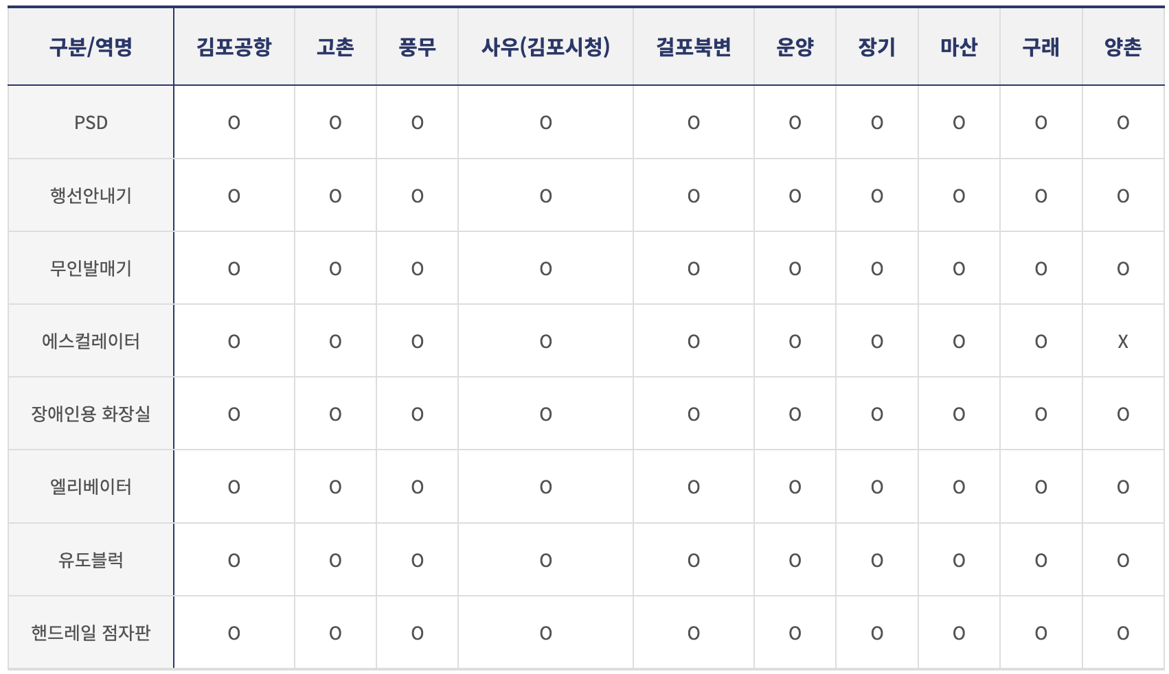 김포골드라인 10개의 역 거의 모두 엘리베이터, 에스컬레이터, 무인발매기, 장애인용 화장실 등의 편의시설을 갖추고 있습니다. 단, 양촌역만 에스컬레이터가 없습니다.