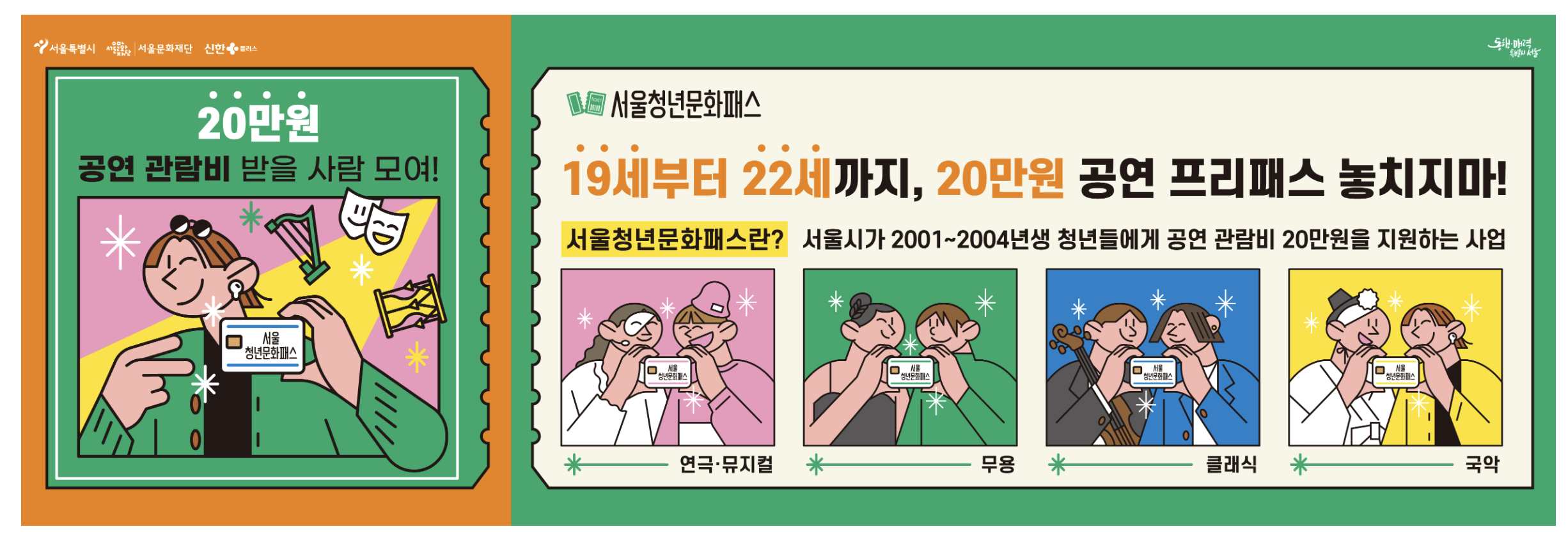 서울청년문화패스는 사회에 첫 발을 내딛는 19세~22세 청년들을 위한 지원사업입니다. 연극, 뮤지컬, 클래식, 오페라, 발레.무용, 국악 등 관람 기회를 제공하고 문화예술분야 활성화를 위해 문화이용권을 지원하고 있습니다.