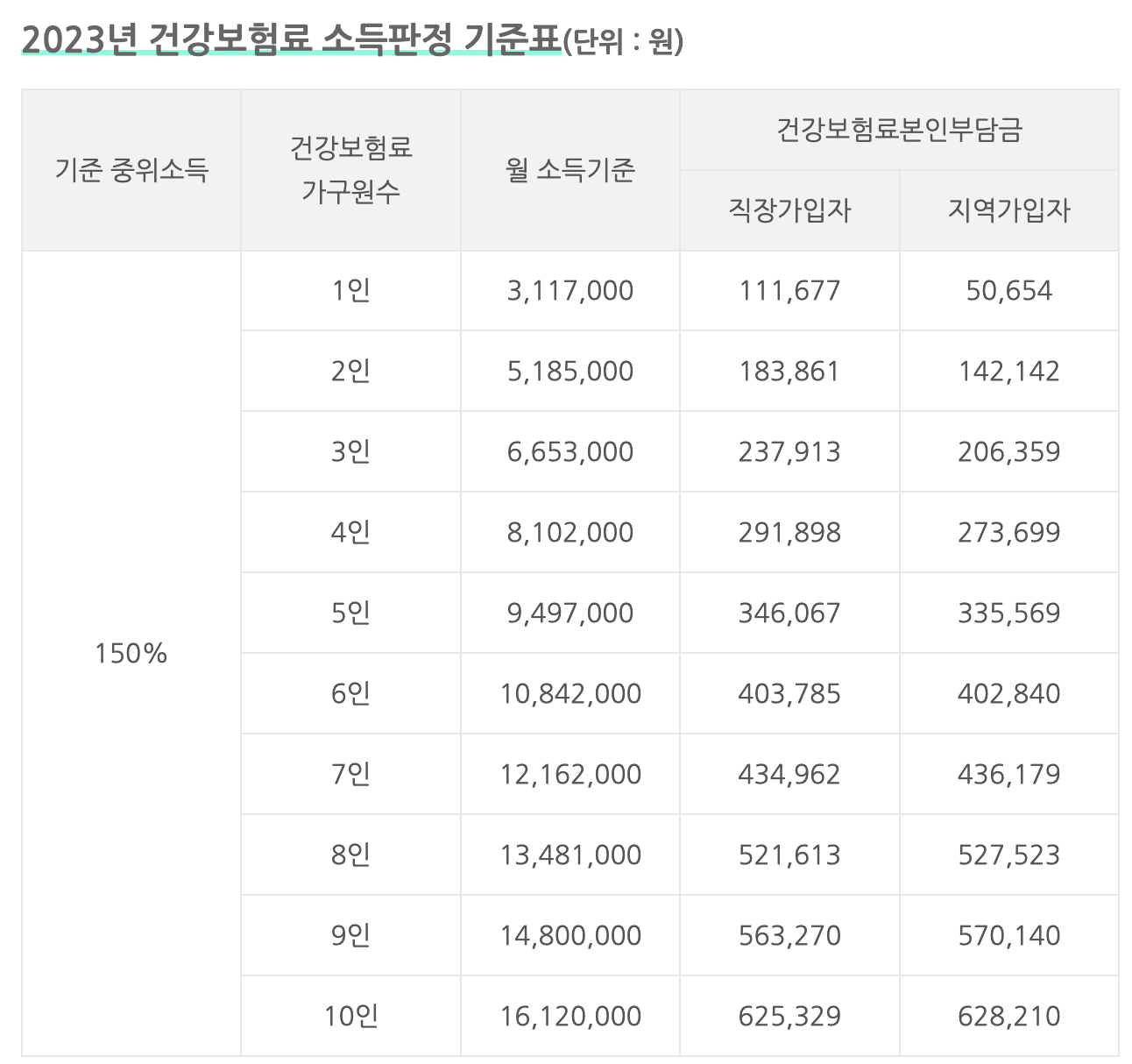 2023년 건강보험료 중위소득 150%는 아래 표를 참고하시기 바랍니다. 1인가구의 경우 월 소득 3,117,000원, 4인가족의 경우에는 월 8,102,000원 입니다.