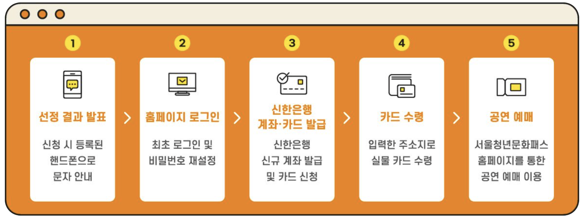 문화지원금 대상자로 선정되면 홈페이지에 방문하여 로그인을 해주세요. 그리고 신한은행에서 신규 계좌를 발급받으시고 카드 신청을 해주세요. 입력한 주소지로 카드를 수령받은 후, 서울청년문화패스 홈페이지에서 자유롭게 공연을 예매하여 지원금을 사용하시면 됩니다.