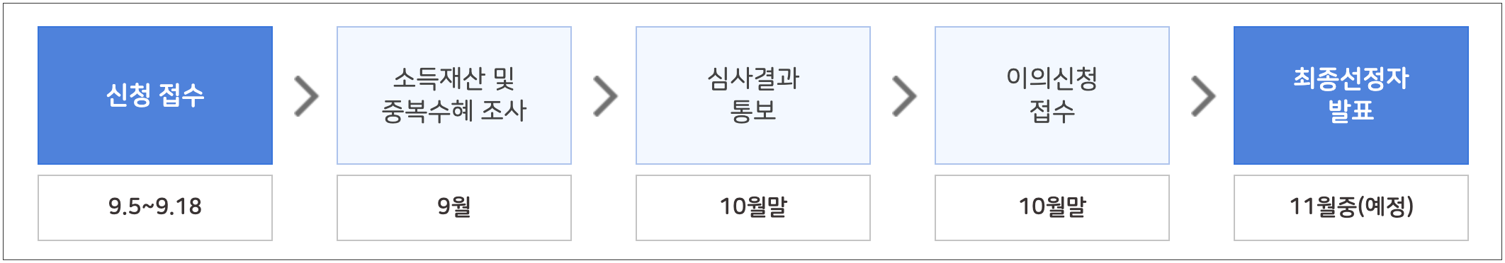 신청 첫날 9월 5일은 접속자가 많아 시스템 과부하가 있을 수 있으니 가급적 9월 5일 이후 신청하시기 바랍니다. 신청 및 접수는 선착순이 아니며, 지원자 선정은 자격심사 후 전산추첨으로 진행될 예정입니다.