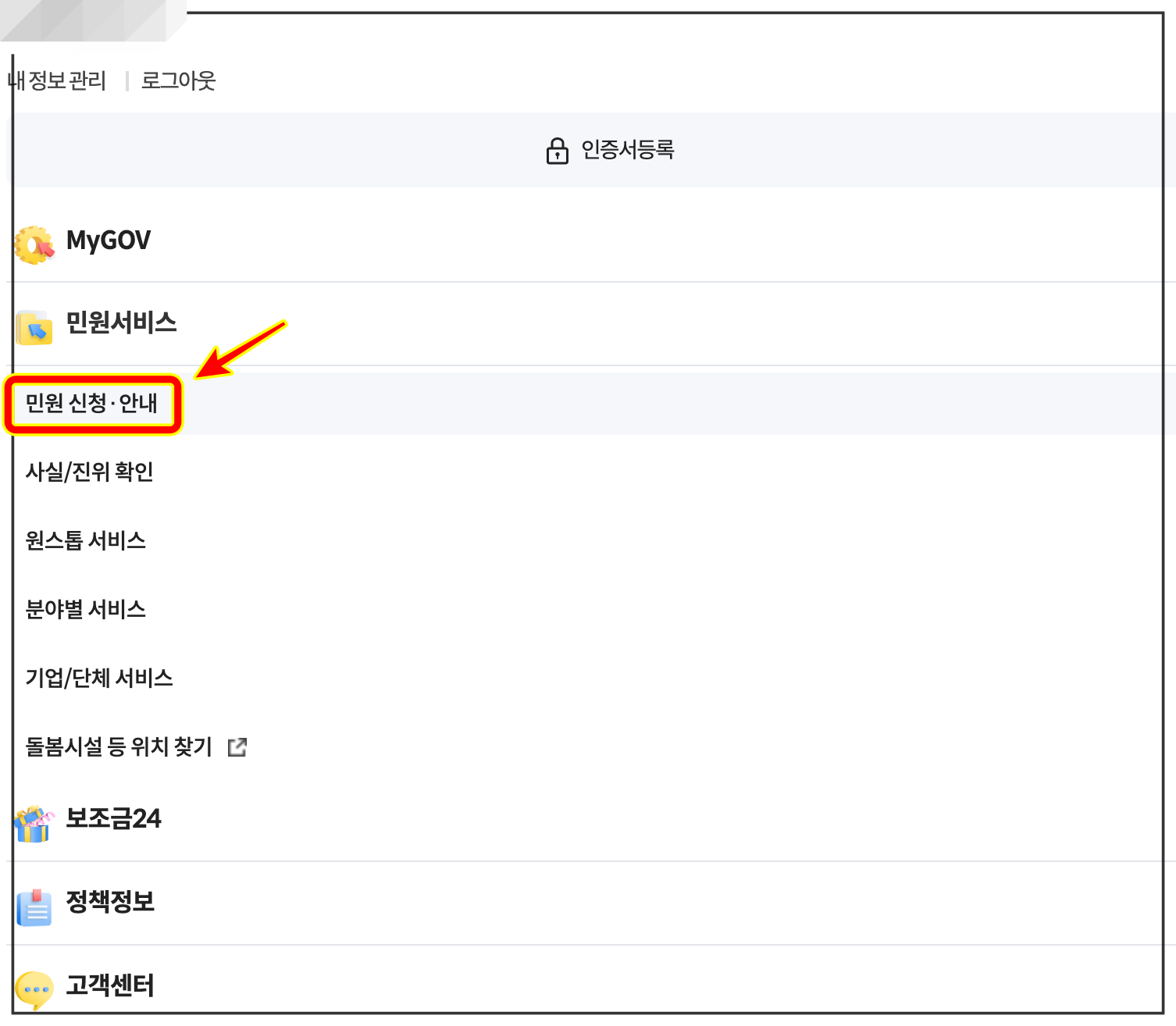 Step 3. 인증 후, 로그인이 되면 화면 좌측상단 ≡ 버튼을 눌른 후, 민원 신청.안내를 눌러주시기 바랍니다.