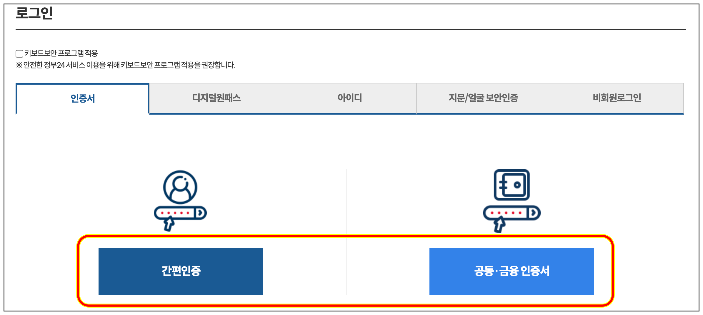- 공동/금융 인증서 : 홈페이지에 인증서를 등록한 후에 이용이 가능합니다. 인증서등록은 아이디로그인 > 인증센터 > 인증등록/관리 > 인증서 등록 메뉴에서 등록이 가능합니다. 인증서 발급은 가까운 은행, 우체국, 증권사에서 인터넷뱅킹, 증권거래용 인증서를 발급받은 후 이용이 가능합니다.