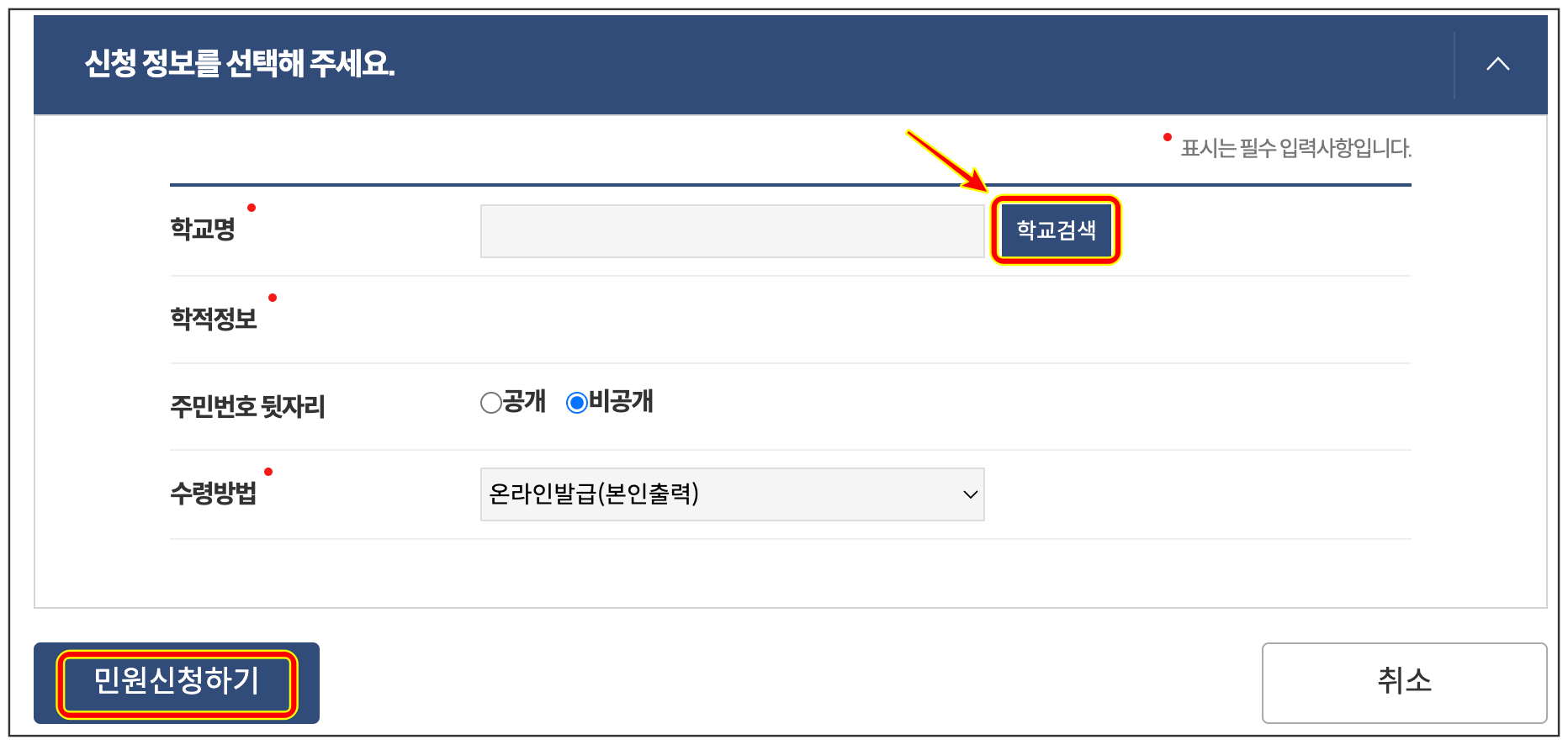Step 5. 신청정보를 입력하세요. 학교검색을 통하여 학교명을 입력하고 수령방법 선택 후, [민원신청하기]를 눌러주시면 됩니다.