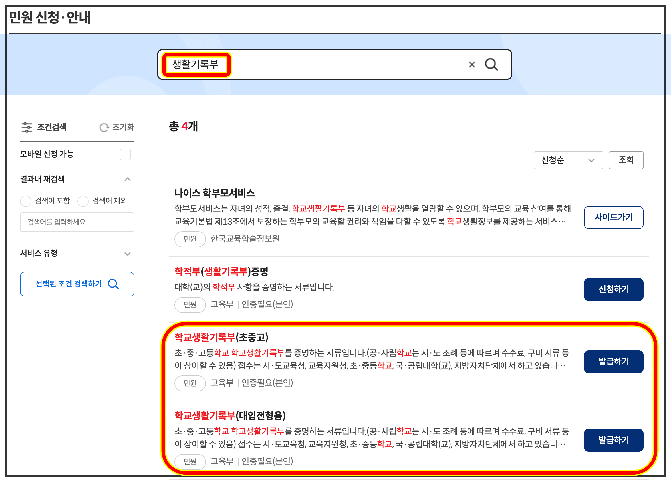 Step 4. 민원 신청.안내 메뉴에 들어가면 상단 돋보기를 볼 수 있습니다. [생활기록부]를 입력 후, 돋보기 찾기 버튼을 눌러주세요.