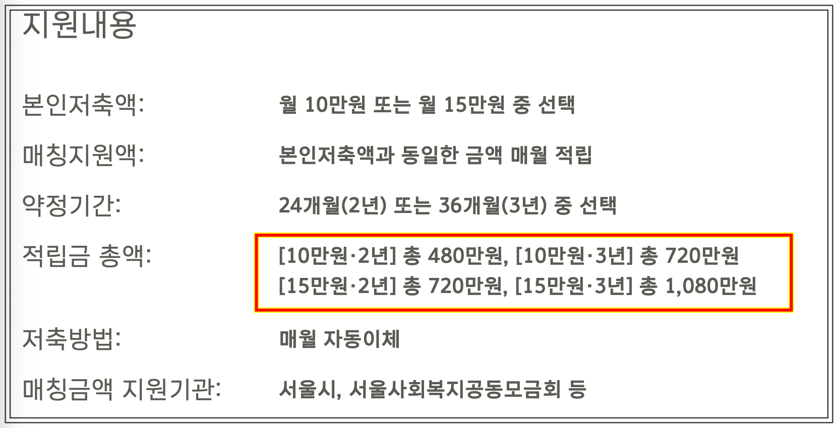 희망두배 청년통장에 가입한 후 2년 또는 3년간 매월 10만원 또는 15만원의 금액을 저축하면, 저축한 금액과 동일한 금액을 서울시 예산과 시민후원금으로 추가 적립하여 지원받게 됩니다.