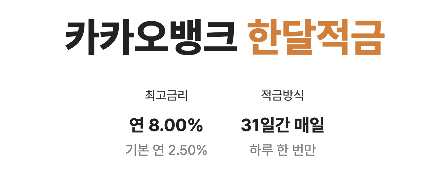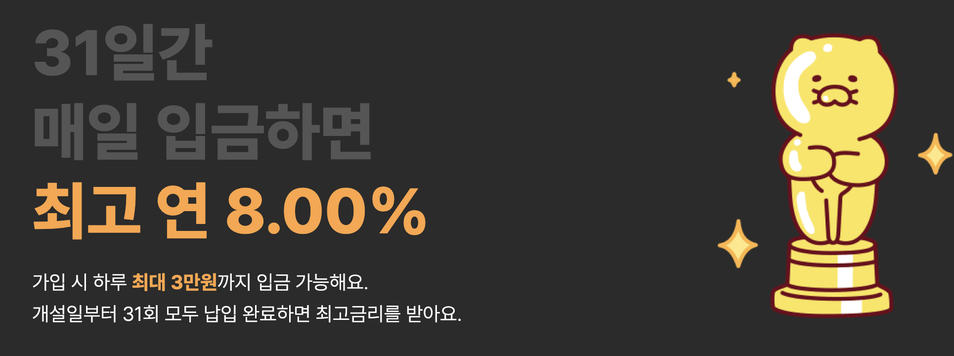연 8.00% 적금이라니! 상당히 높은 금리의 한달 적금 상품이 있습니다. 바로 카카오뱅크에서 출시한 한달적금입니다. 오늘 한달적금에 대하여 살펴보시고, 한달동안 매일매일 적금 도전하셔서 연 8%의 금리도 챙기시기 바랍니다.