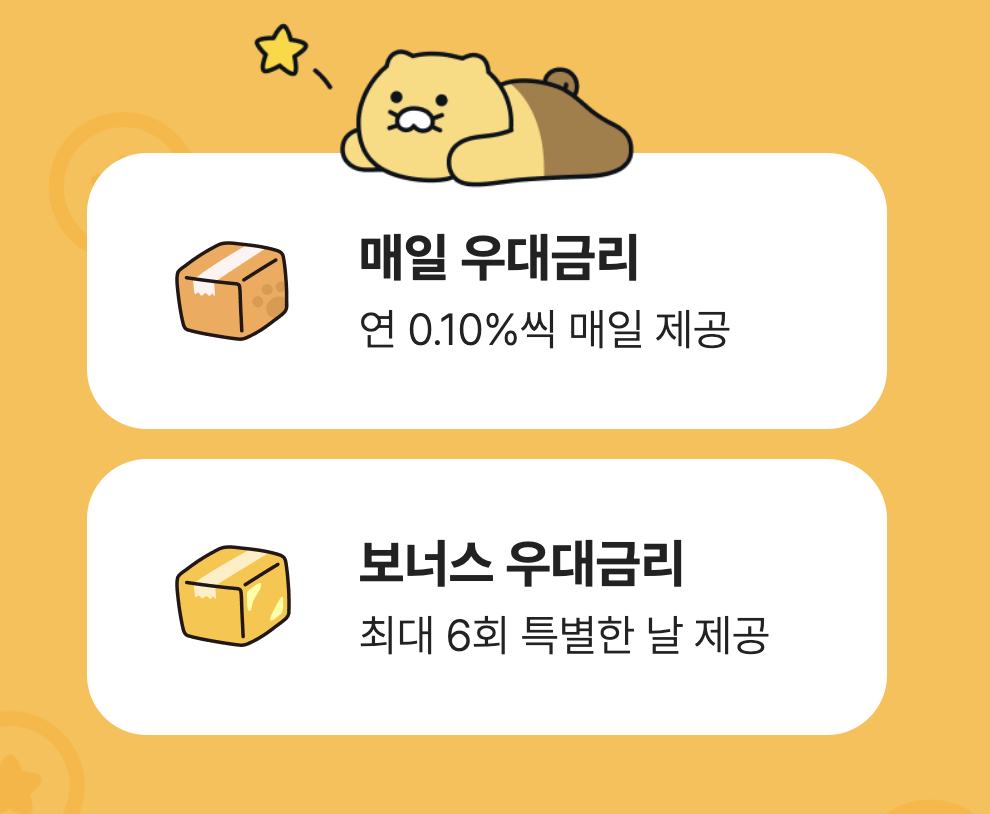 한달 적금은 자동이체 없이 직접 입금을 해야하는 상품입니다. 입금할 때 마다 춘식이가 다양한 혜택과함께 등장합니다. 여기에 꾸준히 입금하다보면 보너스 우대금리를 6번 받을 수 있으니 꾸준히 매일 하는게 포인트입니다.