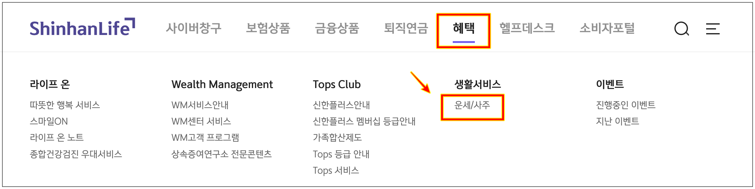 신한라이프 홈페이지 메인을 보시면 상단에 [혜택]이라는 메뉴를 볼 수 있습니다. 이 메뉴의 하위 메뉴 [생활서비스] - [운세/사주]를 선택해주시면 됩니다.
