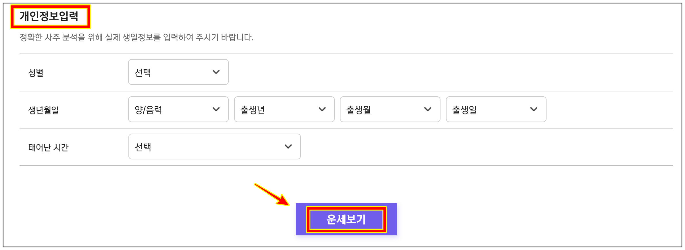 우선 개인정보를 입력해주세요. 아래와같이 성별 / 생년월일 (양/음력, 출생년, 출생월, 출생일) / 태어난 시간을 차례대로 입력 후, 하단 [운세보기]를 클릭하시면 됩니다.
