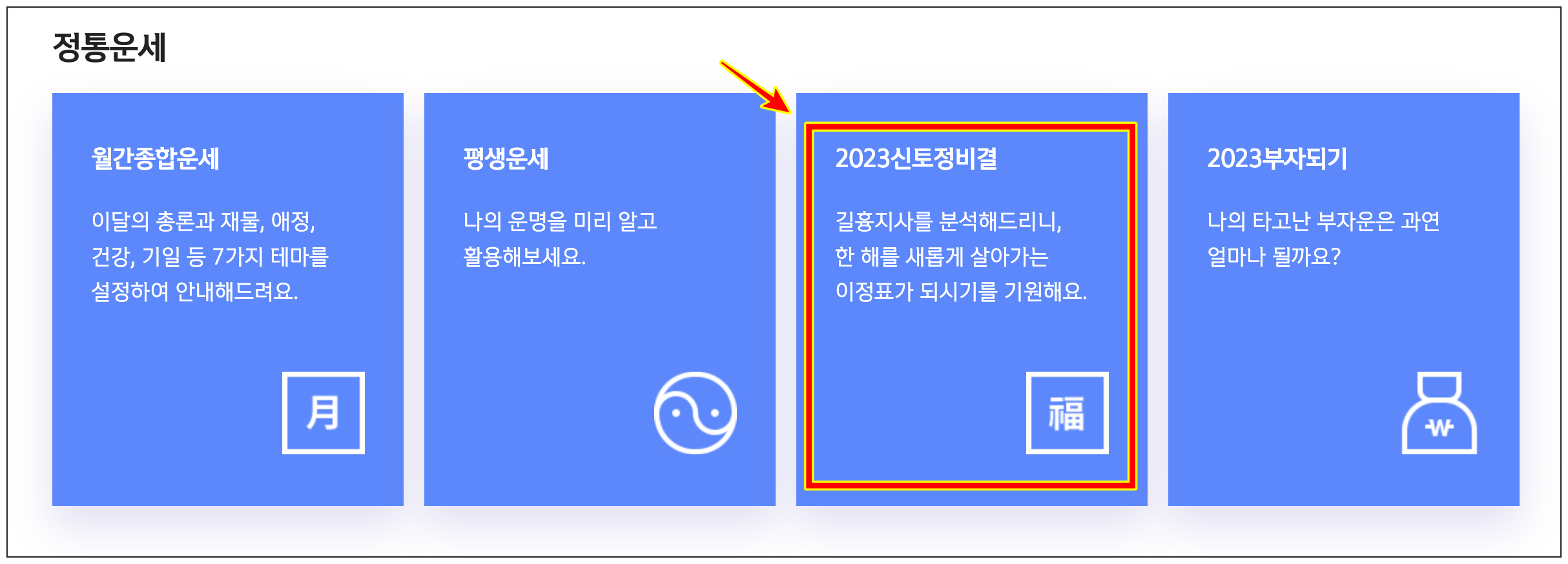 이중 2023 신토정비결을 선택하시면 됩니다. 2023년이라 적혀있지만 이 메뉴에 들어가면 2024년 신토정비결을 바로 볼 수 있습니다.