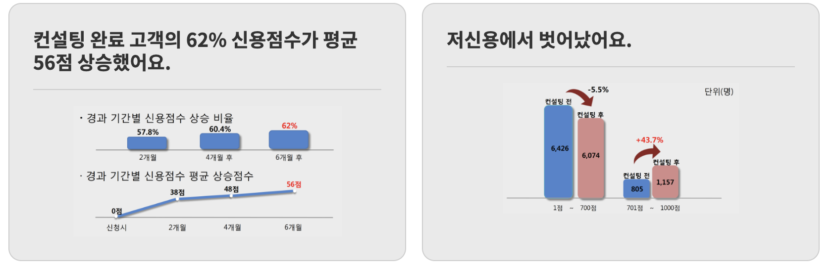 신용.부채관리 컨설팅을 받게되어 신용점수가 오르는 기회를 갖을 수 있습니다. 상담을 통하여 맞춤 솔류션을 받고 실천한다면 신용점수가 평균 56점 상승하고, 저신용에서 벗어날 수도 있습니다.