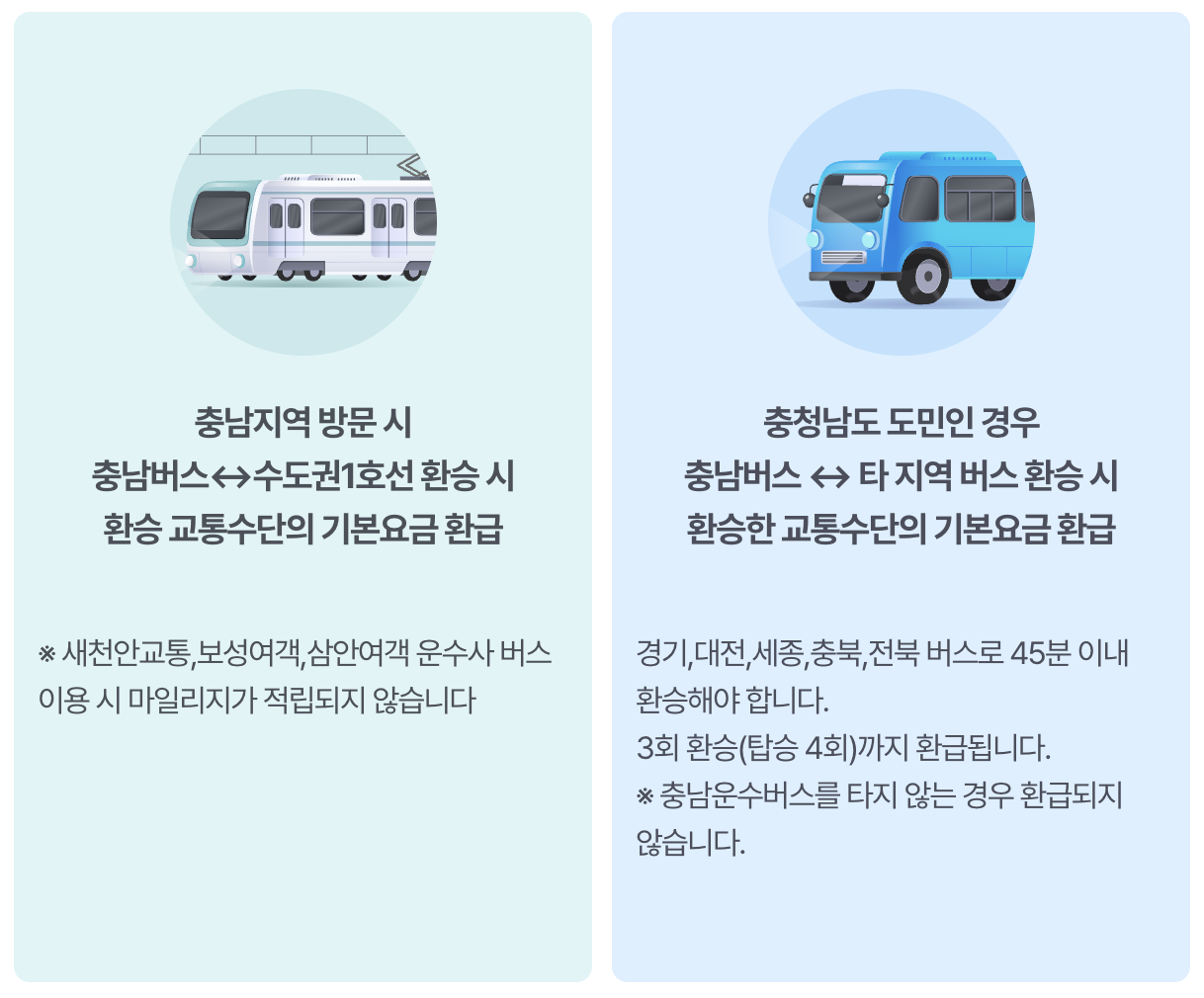 충남지역 방문 시 충남운수사 환승요금은 마일리지로 적립됩니다. 또한 충남도민인경우 추가로 환승혜택을 받을 수 있습니다.
