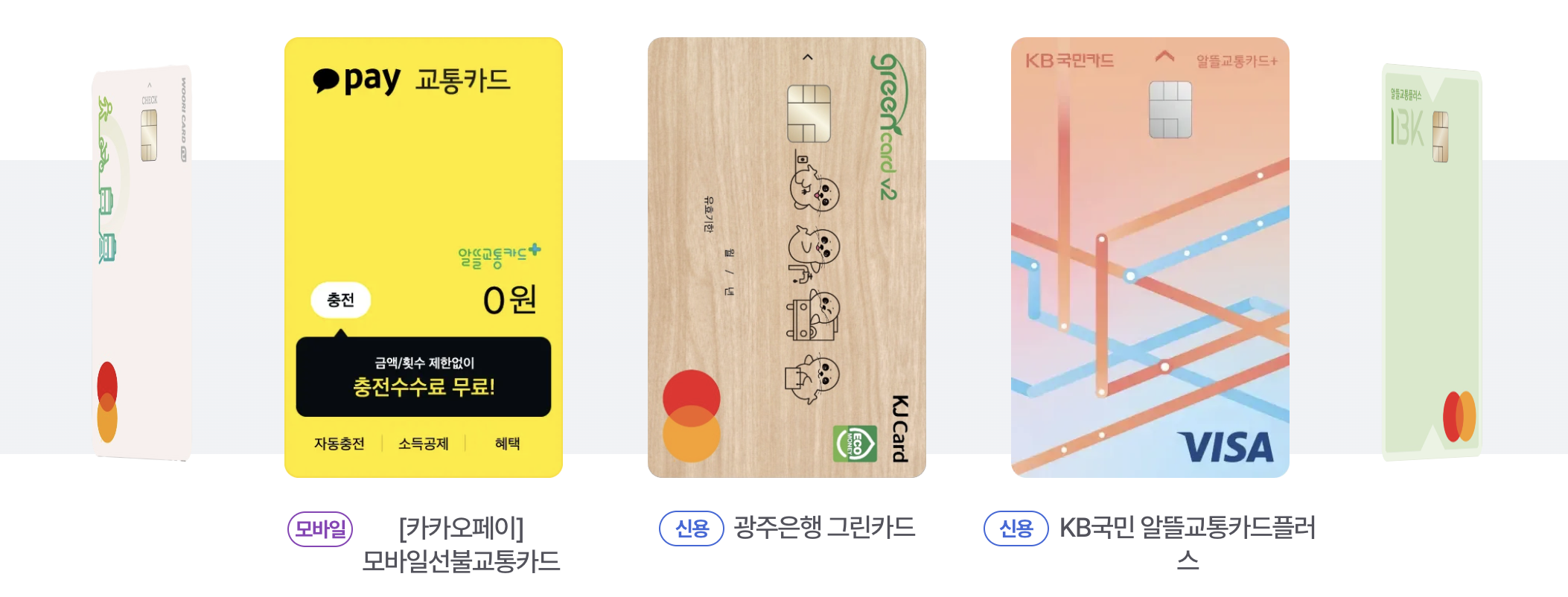 신한카드, BC카드, 삼성카드, 현대카드, 우리카드, 농협, 기업은행, 티머니, 하나카드, KB국민, 캐시비, 케이뱅크, 광주은행 등등 다양한 카드사별 알뜰교통카드가 있습니다.