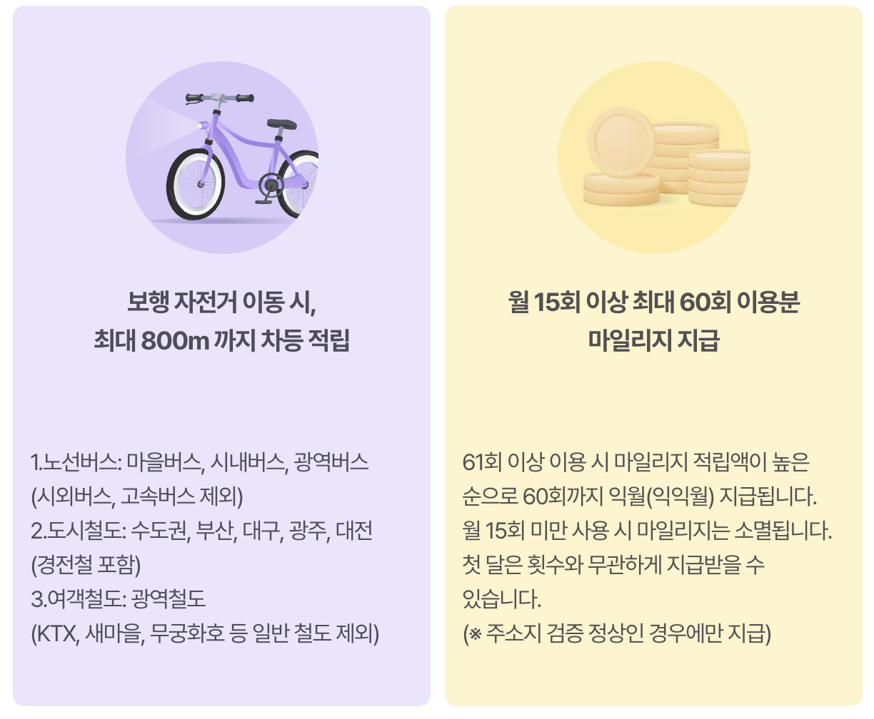 대중교통 1회 이용 시 이동거리 최대 800m까지 인정되며 월 15회 미만 이용 시 적립액은 소멸됩니다.