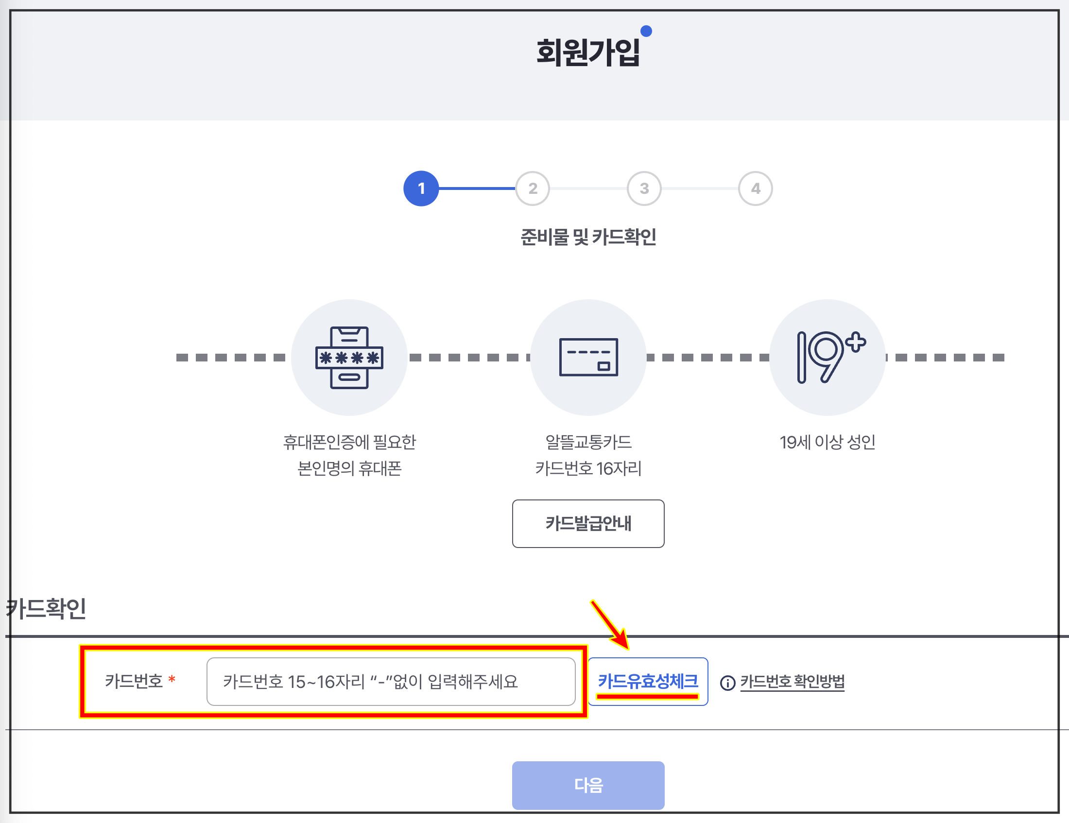 알뜰교통카드는 카드 발급 후 회원가입을 필수로 해야합니다.