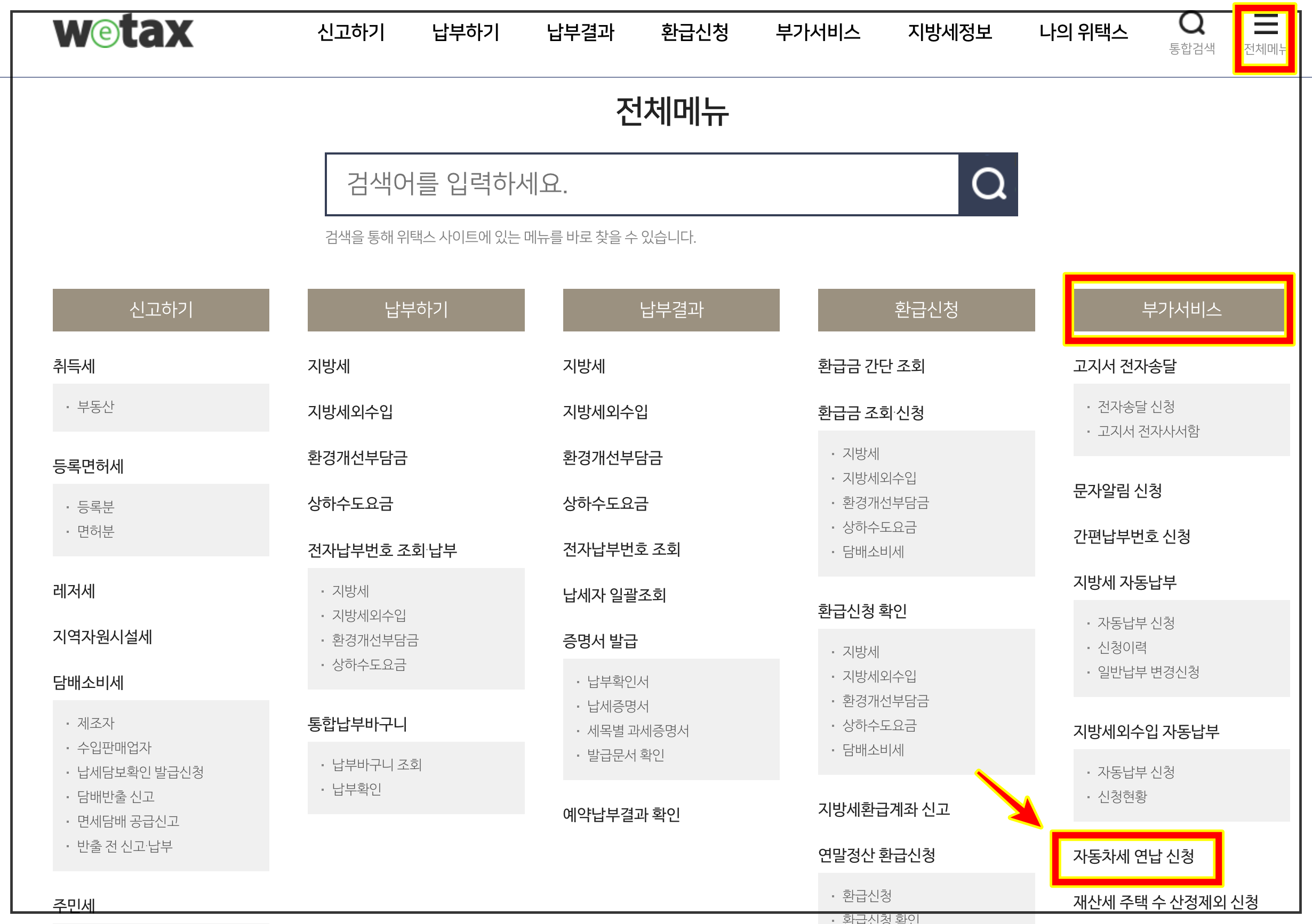 [로그인] > [전체메뉴] > [부가서비스] > [자동차세 연납 신청]
