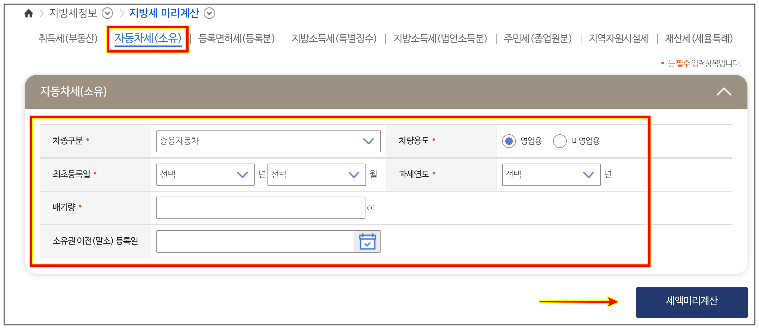 위 메뉴로 들어가서 차종구분 (승용자동차 / 승합자동차 / 화물자동차 / 특수자동차 / 삼륜이하소형차) 선택, 차량용도 선택 후, 최초등록일, 과세연도, 배기량을 입력 후 [세액미리계산]을 누르면 됩니다.