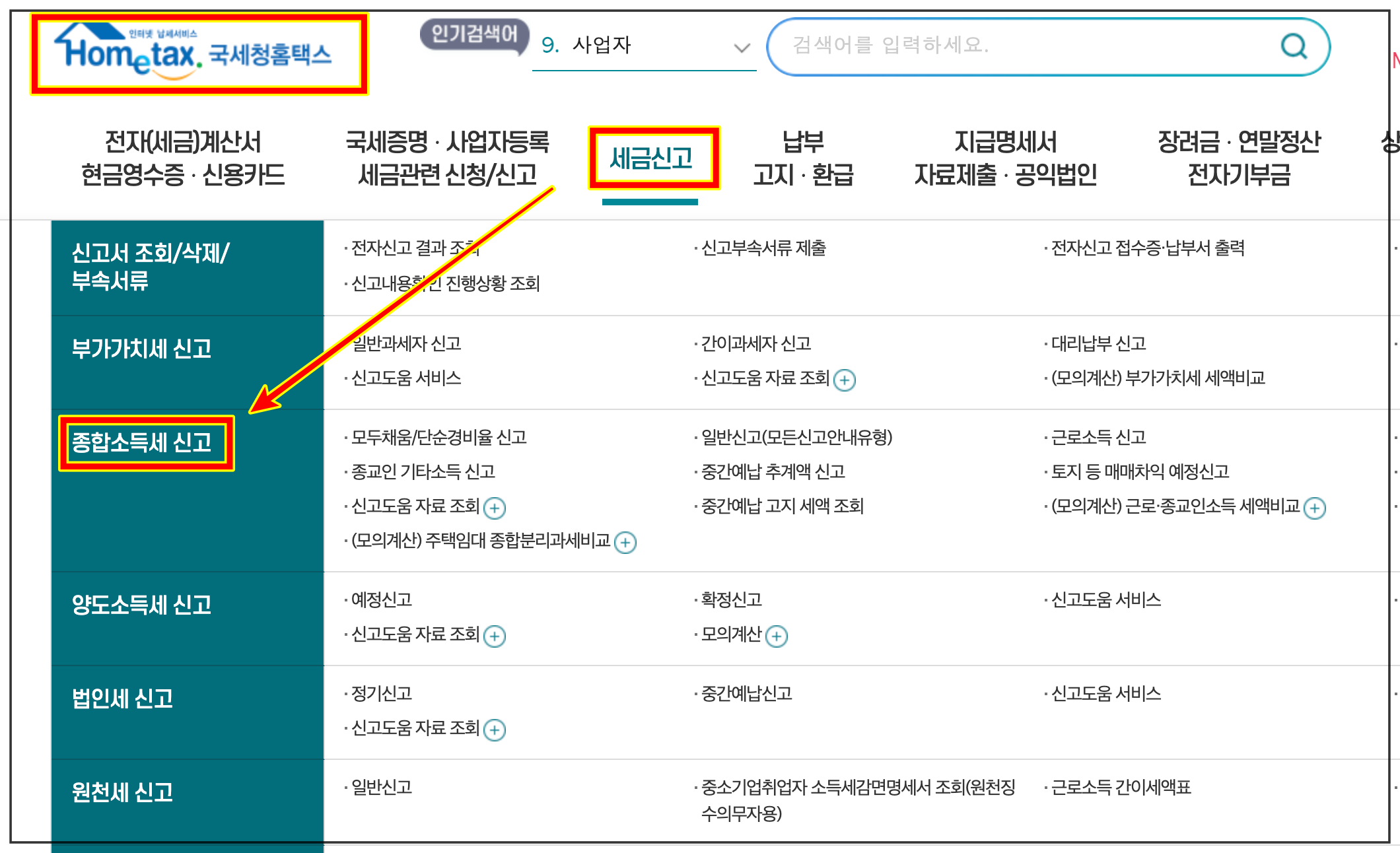 종합소득세 신고는 국세청홈택스 홈페이지에서 가능하며 아래 화면에 보이는 메뉴를 이용하시면 됩니다.