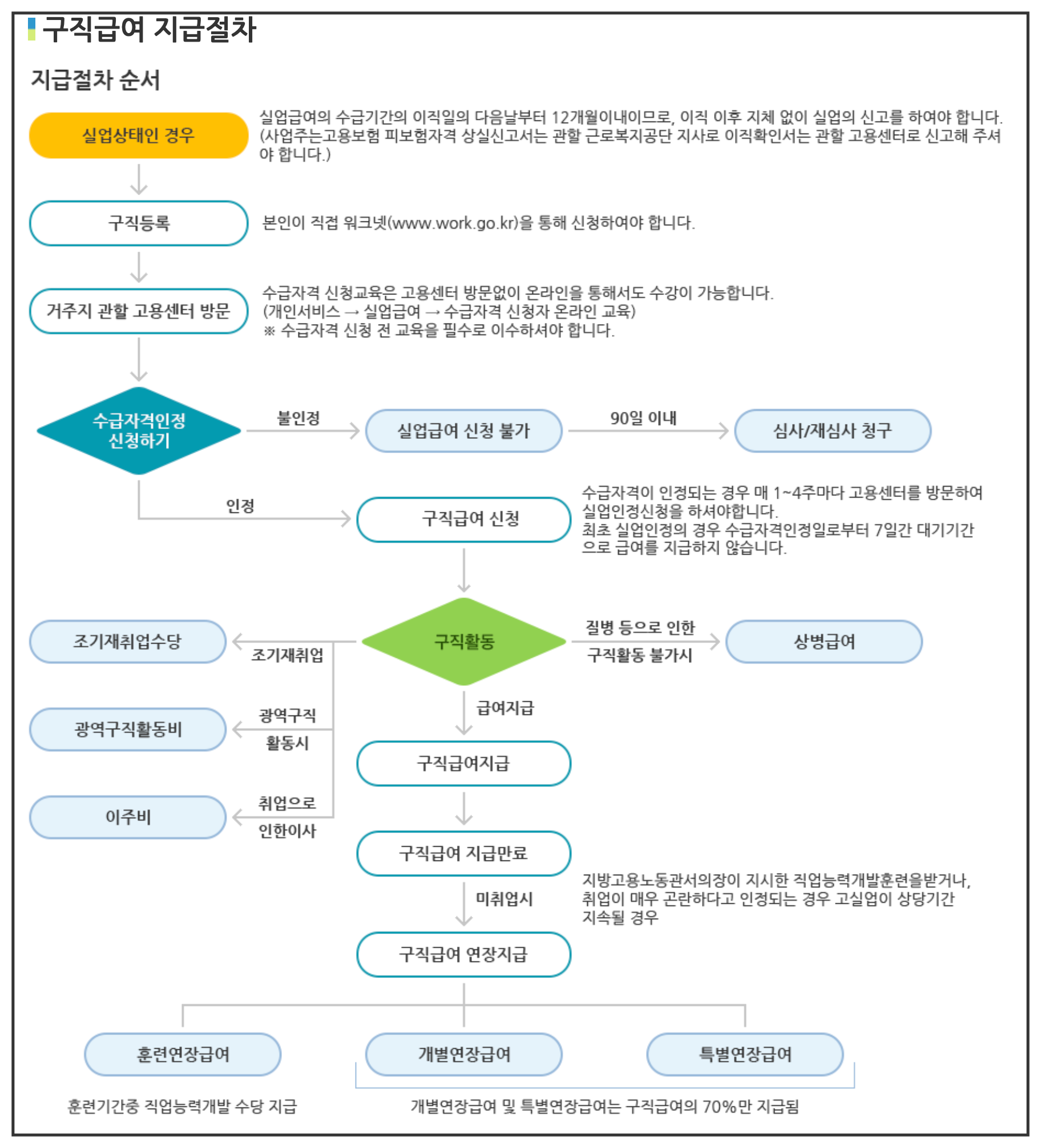 구직급여는 퇴직 후 1년이 지나거나 재취업의 경우에는 지급되지 않습니다. 따라서 빠르게 관할 고용센터에 방문해 실업신고를 해야 합니다.