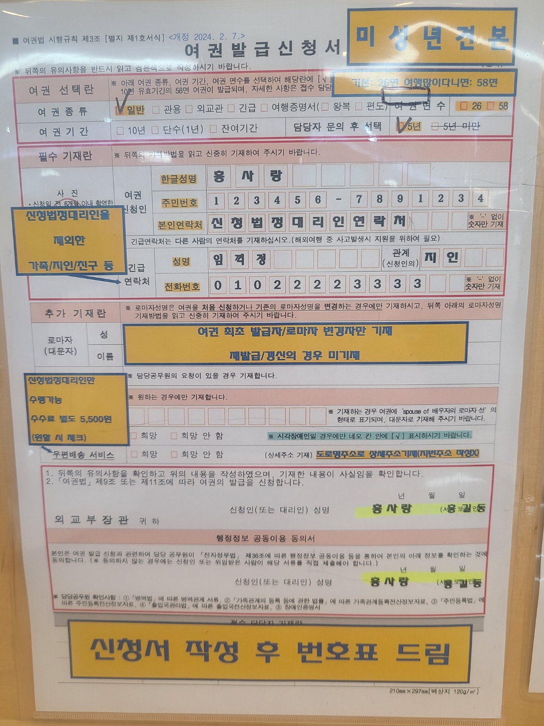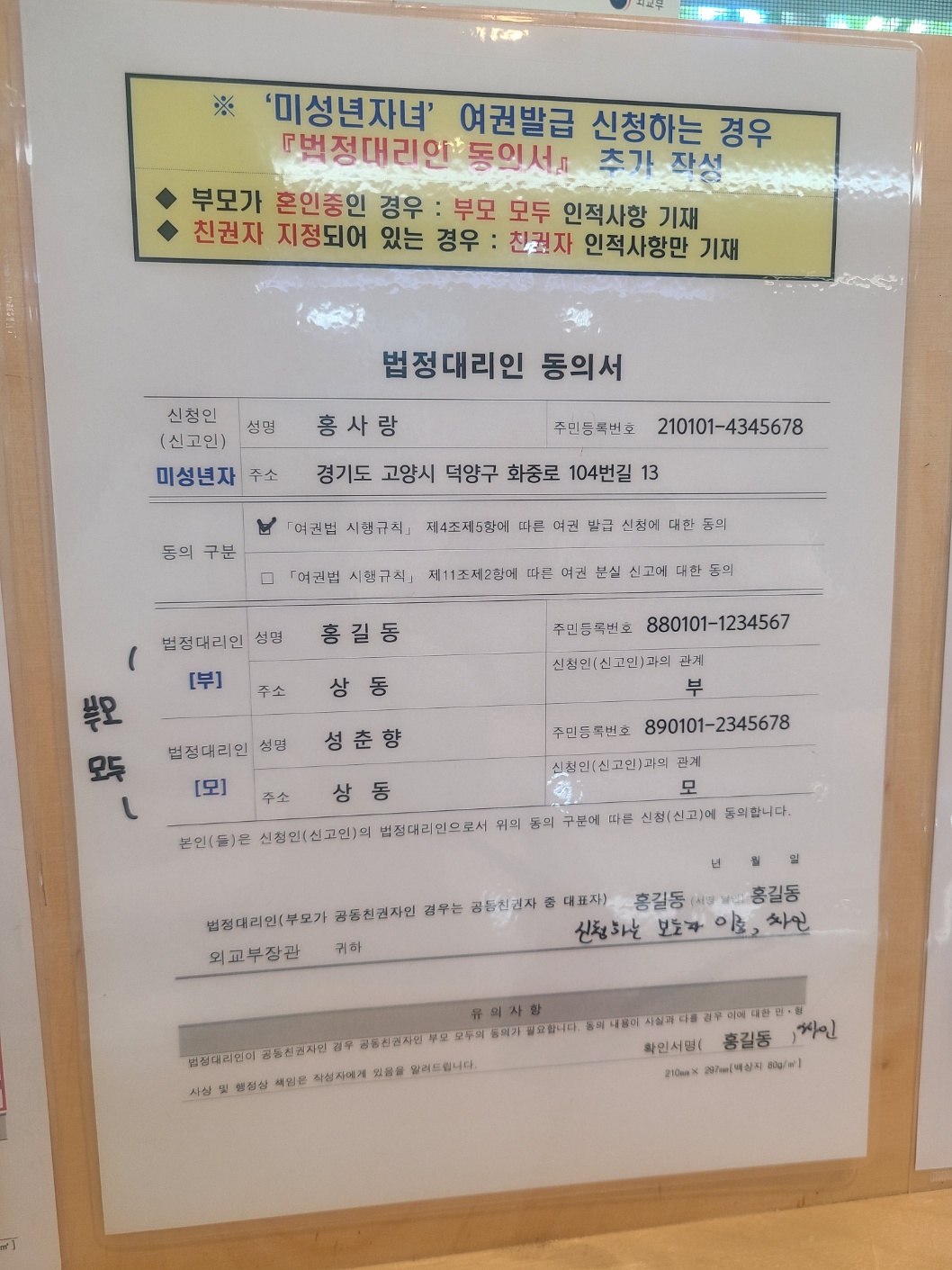 즉, 법정대리인 본인 신분증, 여권사진 1매만 가지고 여권민원실에 방문하시면 됩니다.