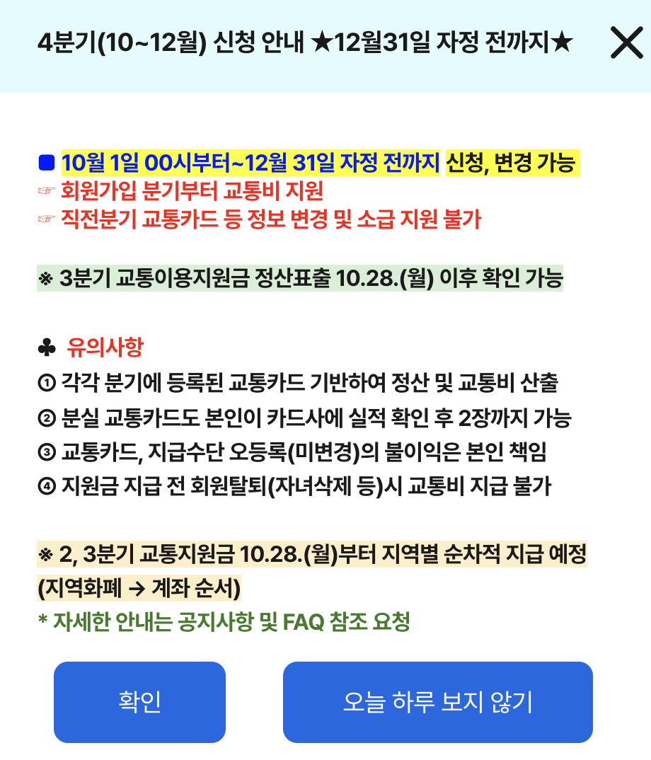 2024년 10월 1일 00시부터 ~ 12월 31일 자정 전까지 신청 및 변경이 가능합니다. 이 지원은 소급 지원이 불가하며 회원가입 분기부터 교통비가 지원됩니다.