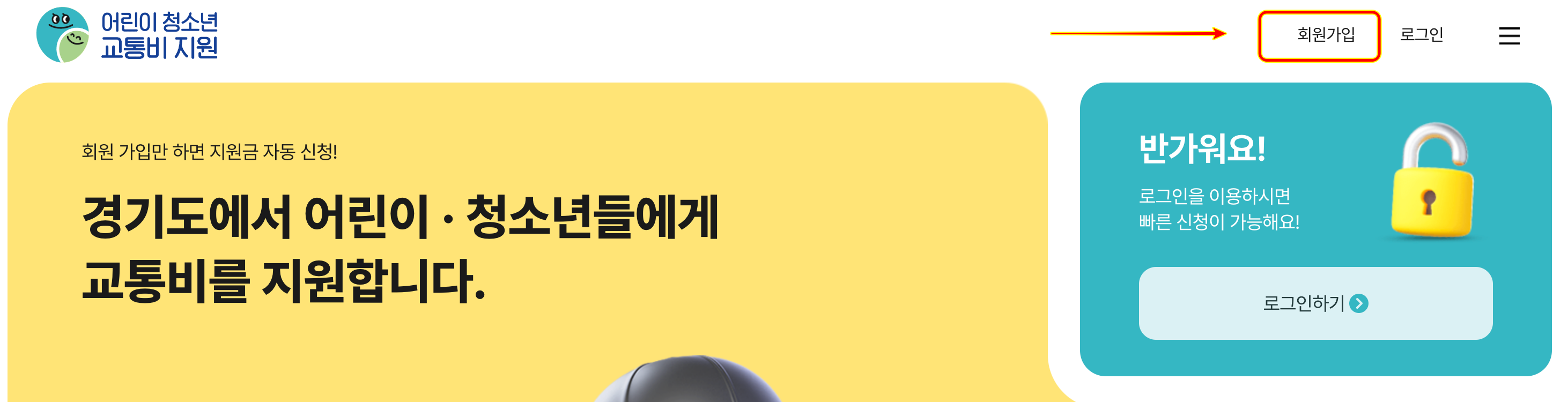 1. 경기도 어린이 청소년 교통비 지원 홈페이지에 접속합니다. 홈페이지 우측상단 [회원가입]을 선택합니다.