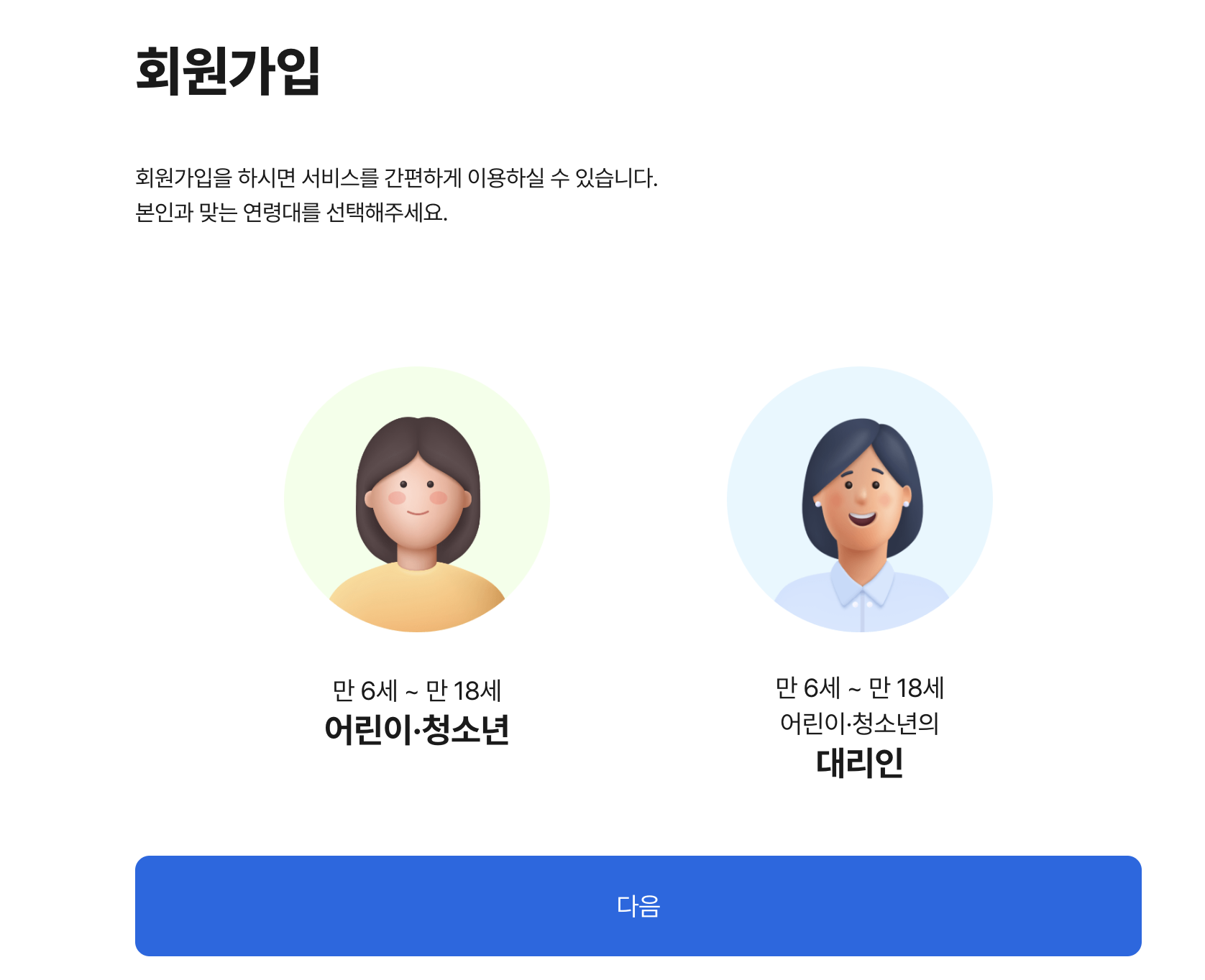 이 때, 본인의 휴대폰 및 인증서인 경우에는 어린이.청소년 본인 인증서를 사용해야합니다.