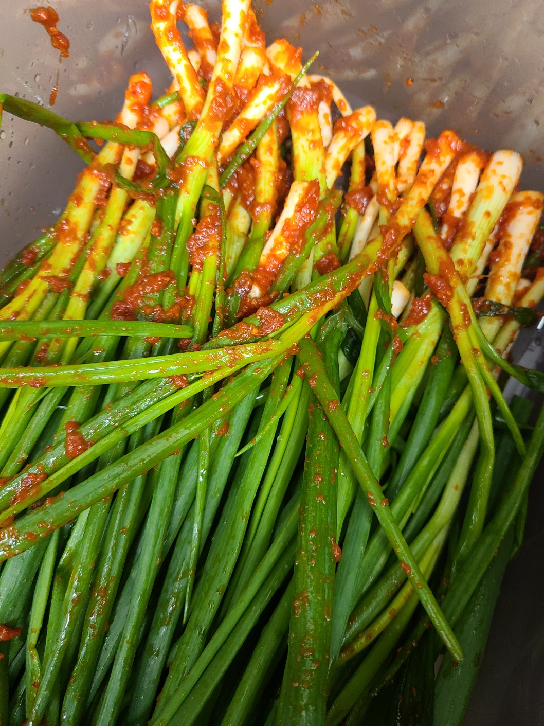 파김치의 포인트! 파의 흰 부분 위주로 양념을 바르며 문질러 줍니다. 그렇게 문지른 후, 남은 양념으로 이파리 부분을 묻혀줍니다.