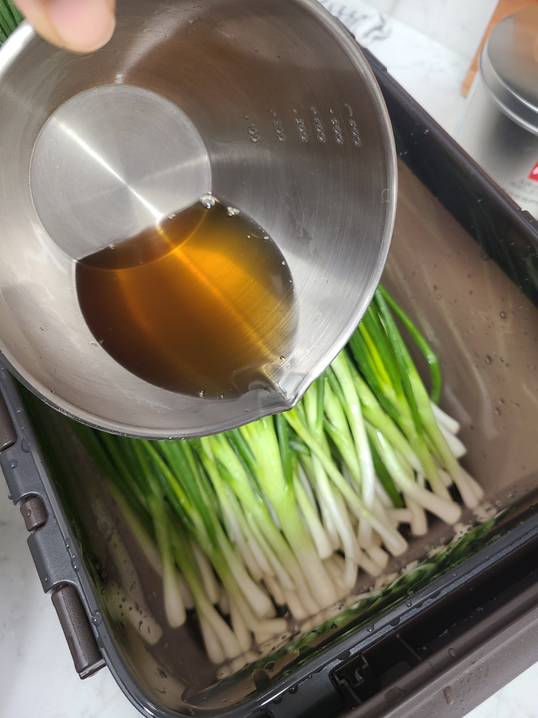 양념을 준비하는 동안 30분이 흐르고, 절여진 파의 액젓을 양념 볼에 모두 따라 넣어주세요. 그리고 다시 섞어 주세요!