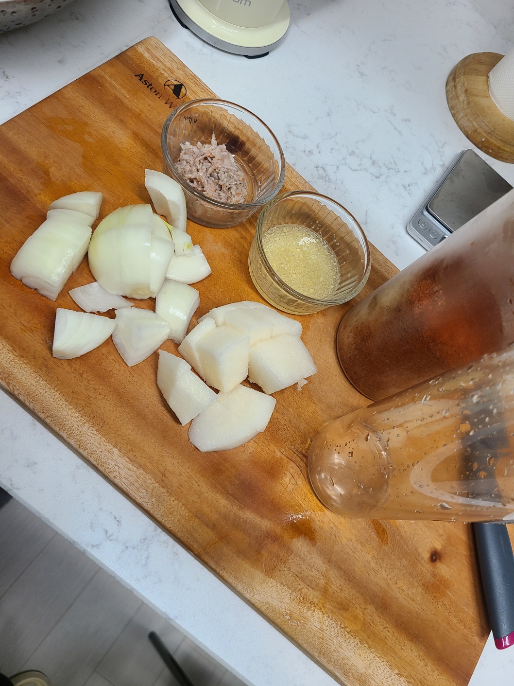 위에 안내드린 분량의 양파, 배, 생강, 새우젓, 설탕을 믹서에 넣어 곱게 갈아줍니다.