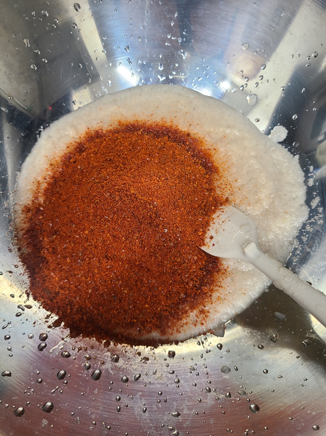 갖은 재료를 넣고 곱게 갈아준 양념을 볼에 담아주고 고춧가루를 넣어 섞어 줍니다. 매콤한걸 좋아하신다면 청양 고춧가루를 섞어주시면 좋습니다.