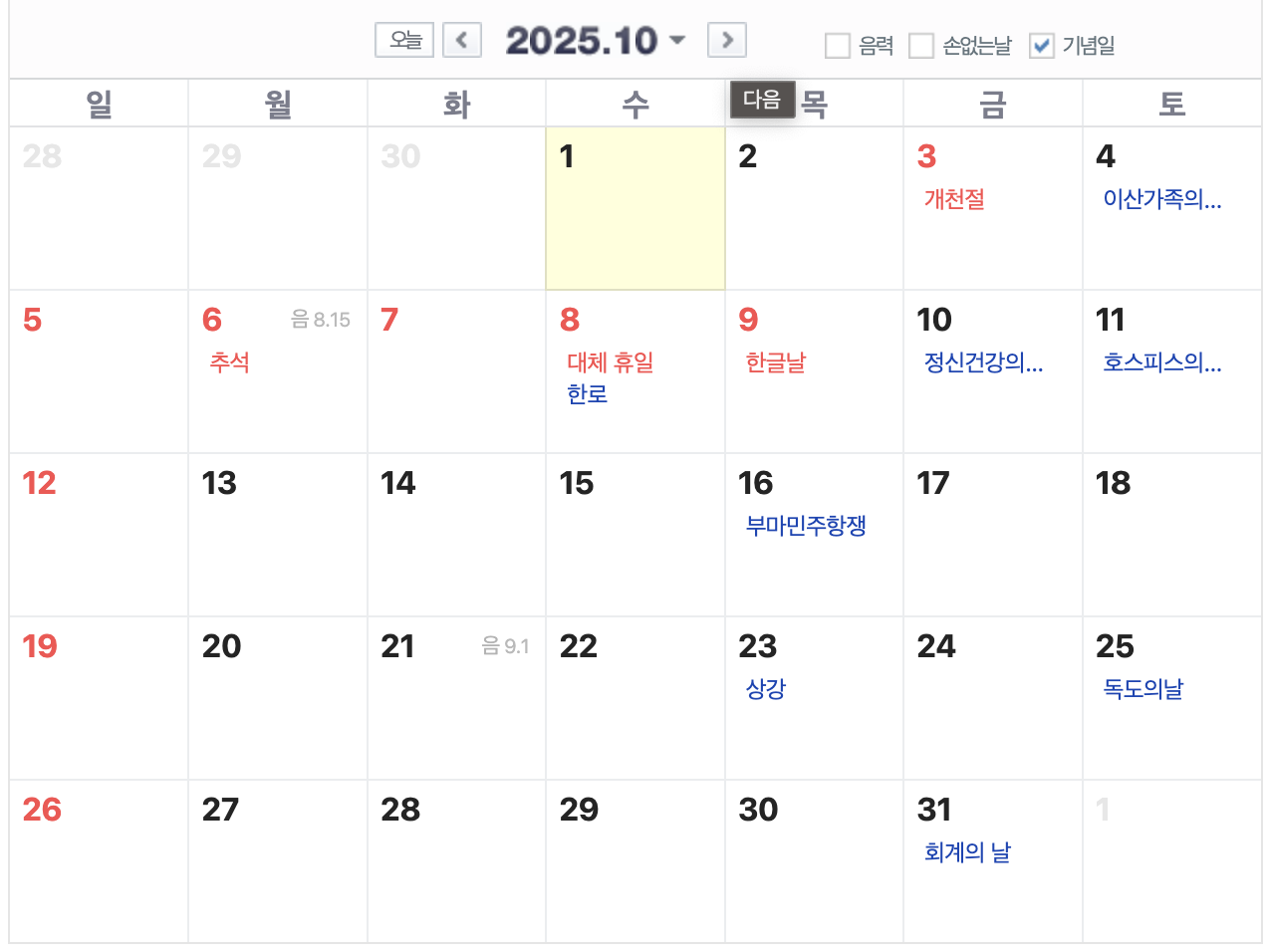 25년 9월에는 공휴일이나 명절 없이 30일을 보내야겠습니다. 보통 9월에 추석명절이 있는데 25년은 윤달이 있는 해여서 추석명절이 10월에 있습니다.