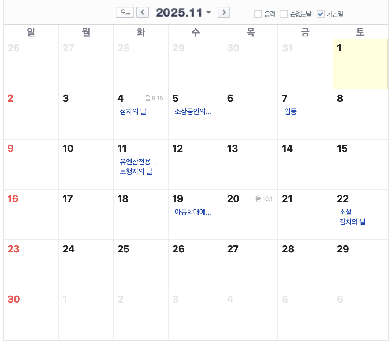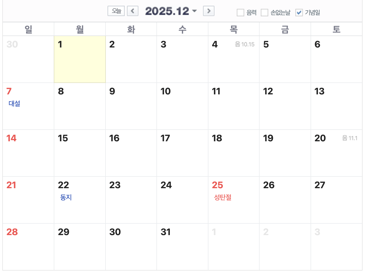 25년 11월은 특별한 휴일이 없습니다. 12월에는 25일 성탄절이 있고 목요일입니다.