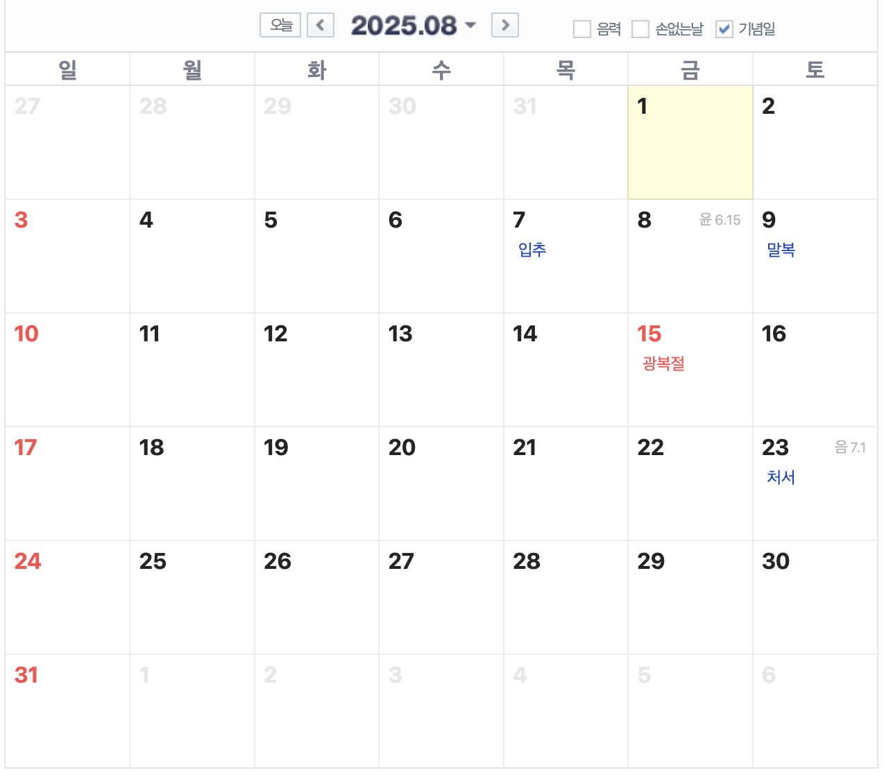 25년 8월은 15일 금요일이 광복절로 공휴일이 있습니다.