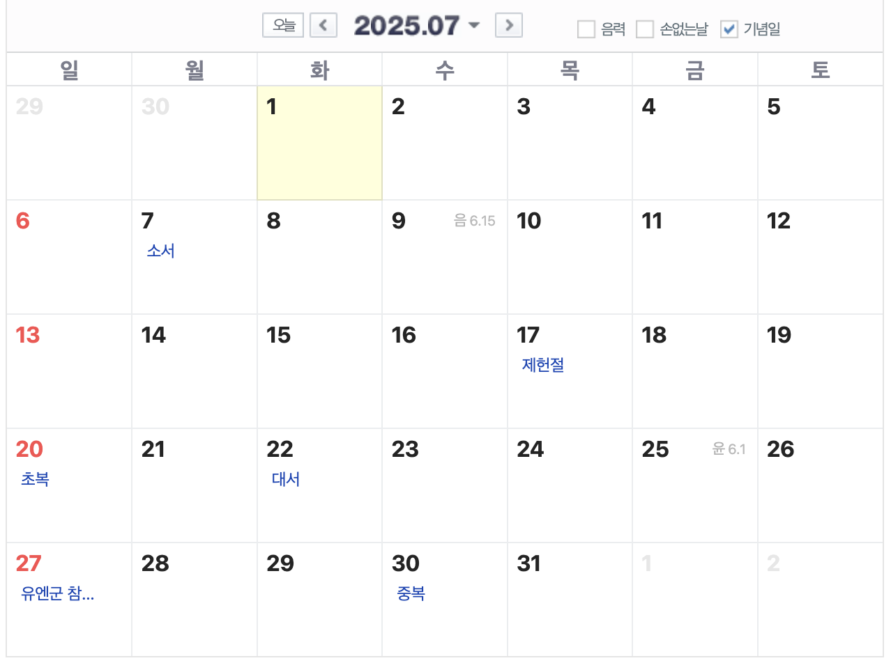 25년 7월은 특별한 공휴일 없이 31일까지 있는 달입니다. 하지만 보통 7월 말부터 여름휴가가 있는 달이죠! 여름휴가 계획을 서둘러 세워둬야겠습니다.