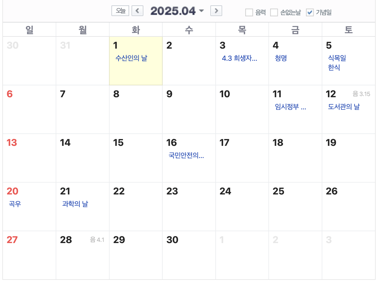 25년 4월은 공휴일도 없고, 대체공휴일도 없네요 ㅠㅠ 30일 열심히 달려야겠습니다!