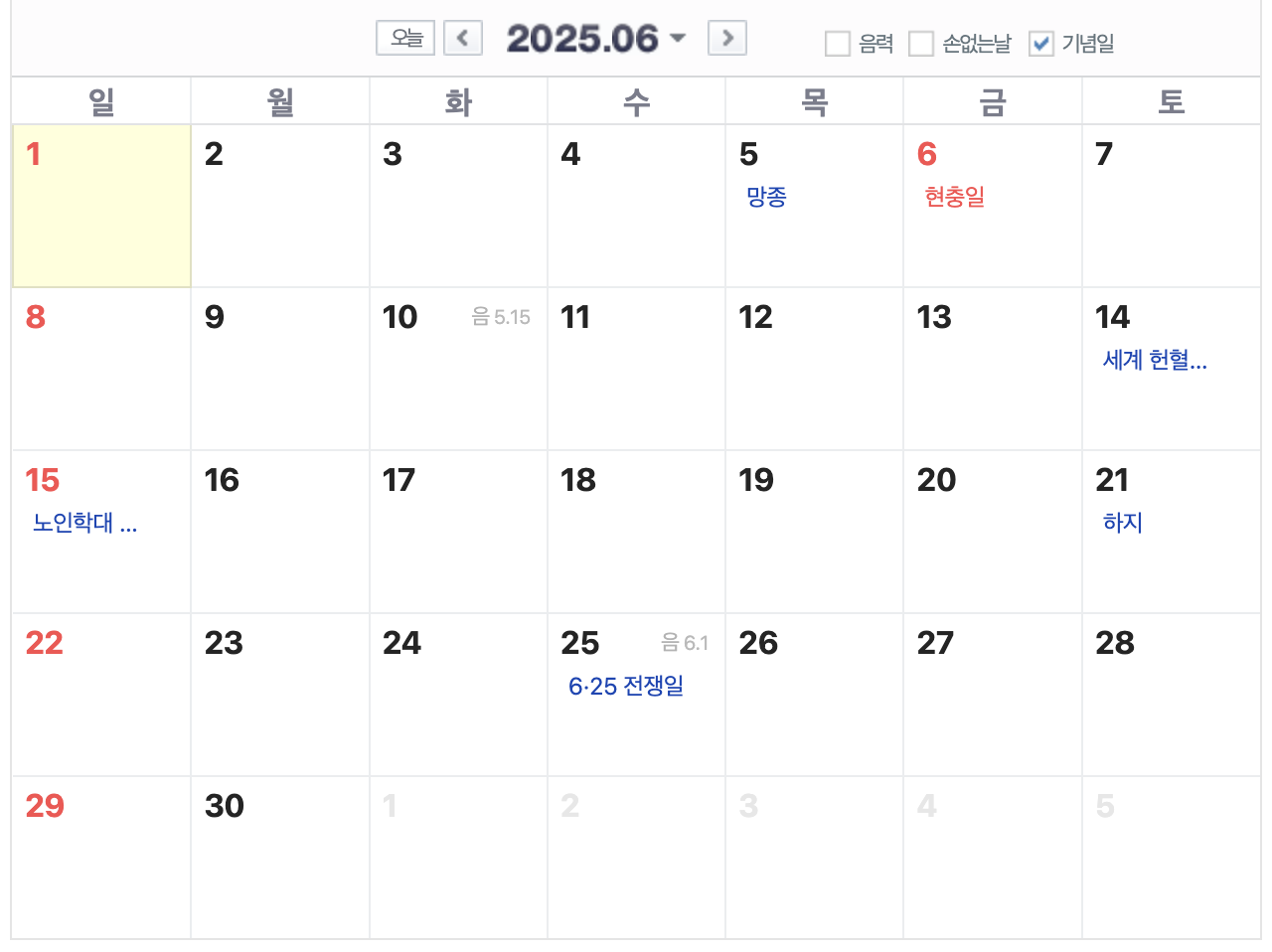 25년 6월에는 6일 금요일 현충일이 있습니다. 6일 금요일 ~ 8일 일요일까지 쉴 수 있겠네요. 이 외에는 공휴일이 없는 달입니다.