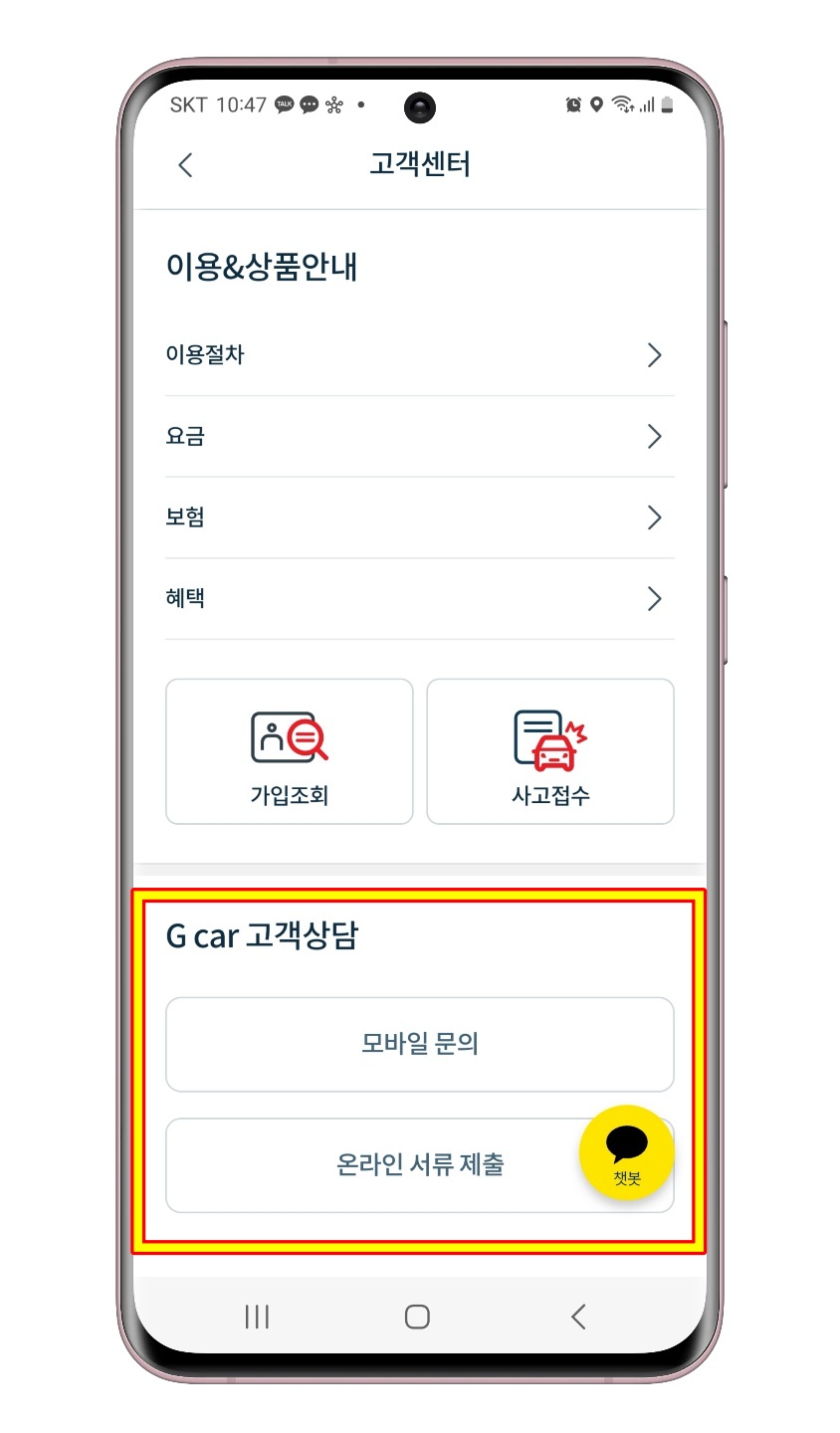 아래와같이 G카 앱 - 고객센터 - G car 고객상담 메뉴를 통해 상담도 가능합니다. 모바일 문의 혹은 챗봇을 통하여 상담을 진행해도 되겠습니다.