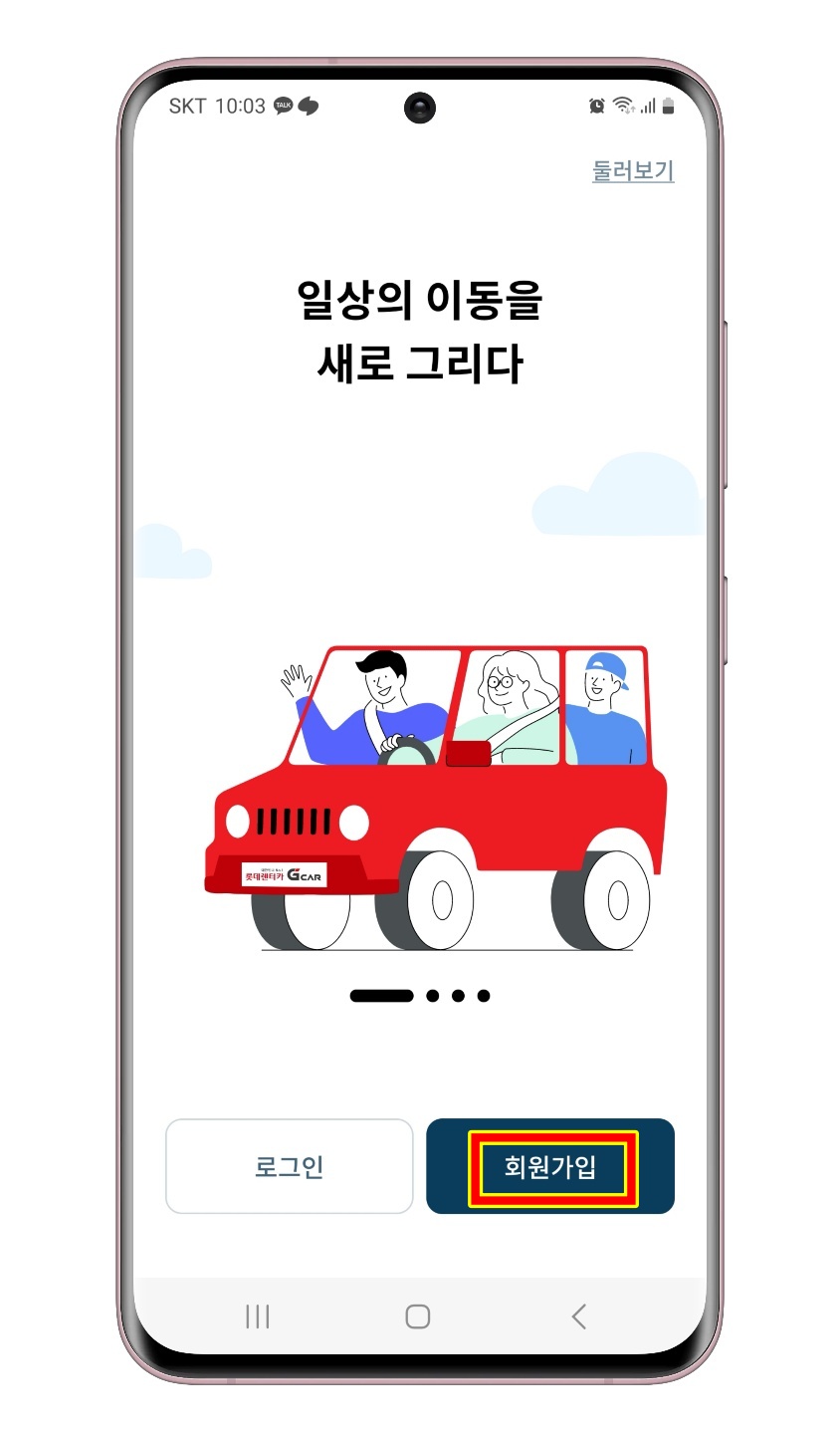 G카 앱을 설치를 하면 아래와 같은 화면을 볼 수 있습니다. 처음이시라면 회원가입을 진행해주세요. 이 때 운전면허증 등록이 필요하니 미리 준비해두시기 바랍니다.