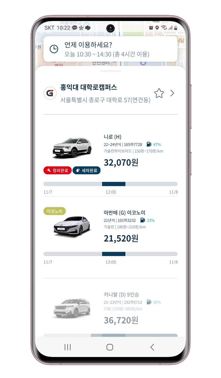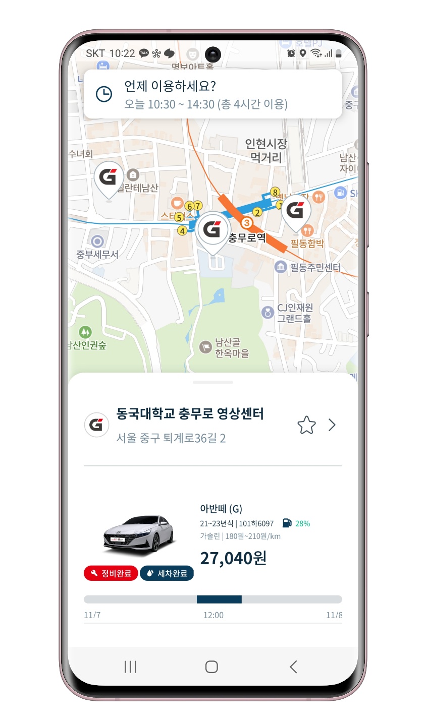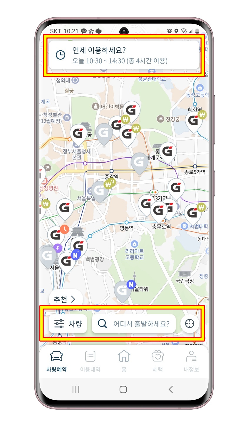 선택한 시간과 장소에 렌트할 수 있는 차량이 있다면 G카 로고가 진하게 표시되어 있습니다. 차량이 없다면 연회색의 G카로고를 볼 수 있습니다.