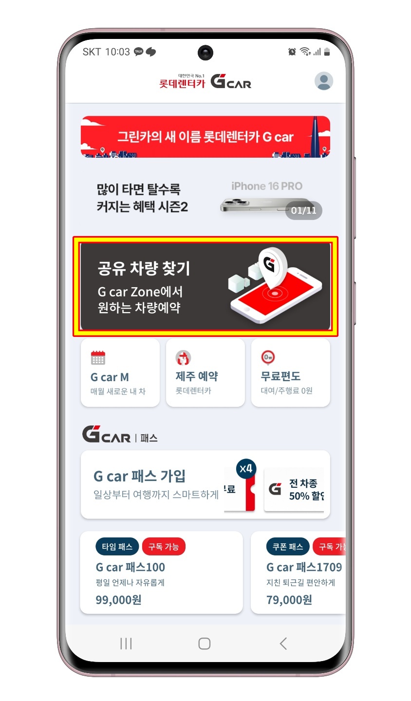 로그인 후, 롯데렌터카 G카 메인 화면을 보시면 가운데 [공유 차량 찾기] 배너가 보이실 겁니다. 이 [공유 차량 찾기]를 누르시면 지도가 나오게 됩니다.